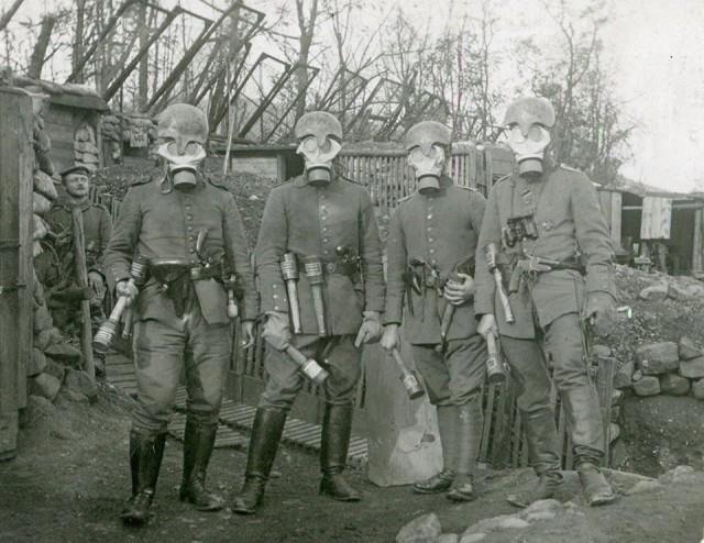 ПМВ, Гренадеры штурмгруппы в экспериментальных шлемах, защищающих нос.