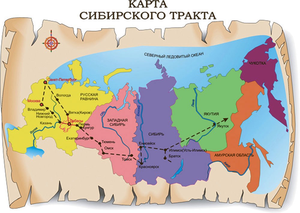 Обычно в справочниках можно прочитать, что строительство этого грандиозного пути было положено с указа от 1733 года. Строительство было завершено только во второй половине 19 века. Чтобы понять этот долгострой, достаточно привести список городов, нанизанных на эту нитку. Кроме Москвы и Санкт Петербурга там есть Муром, Казань, Пермь, Екатеринбург, Тюмень, Тобольск, Чита… ну и так далее аж до самого Китая. Вот примерная схема этого пути: