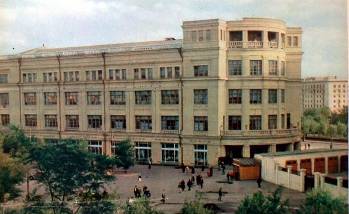 Так выглядел Универмаг "со двора" между 1957 и 1965 годами (справа уже видны гаражи построенного в 1957 году "Интуриста", но между зданиями ещё есть узкий проезд, а это означает, что фасада 1965 года ещё нет):