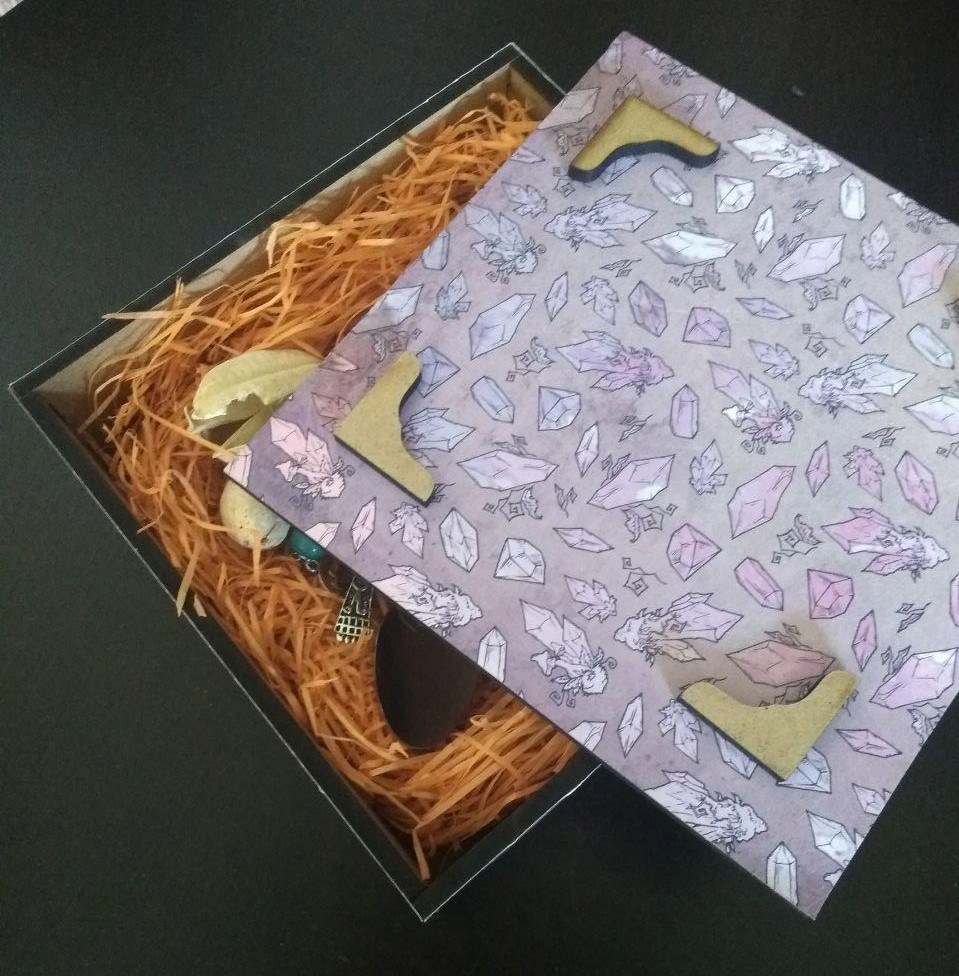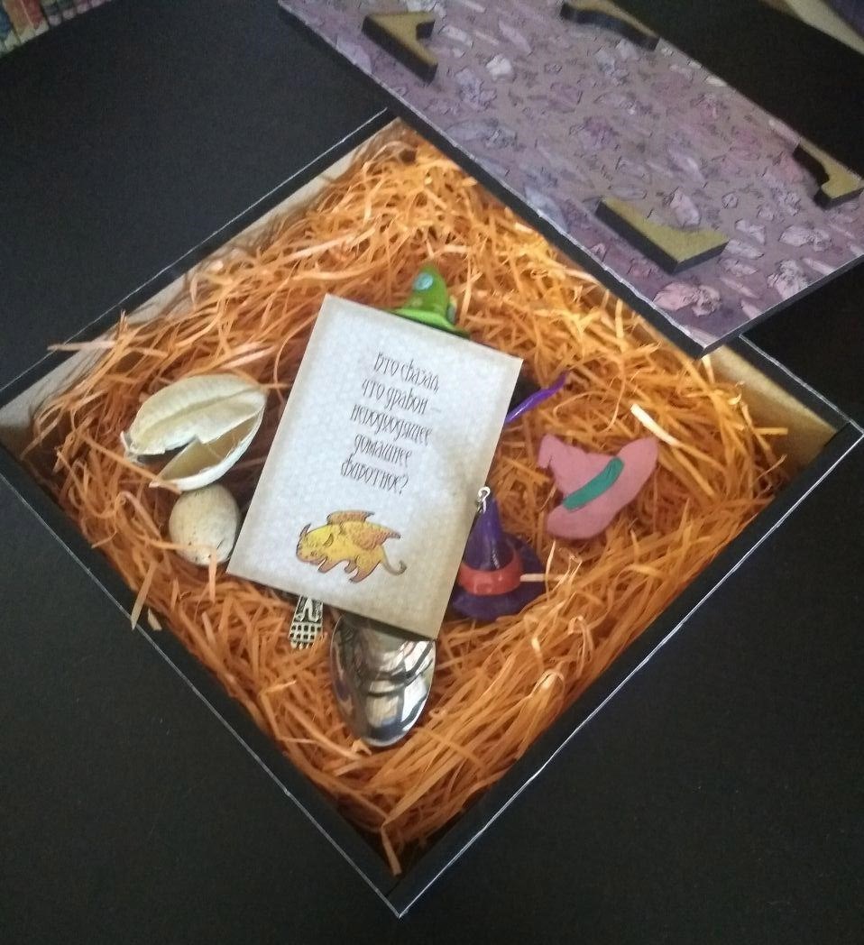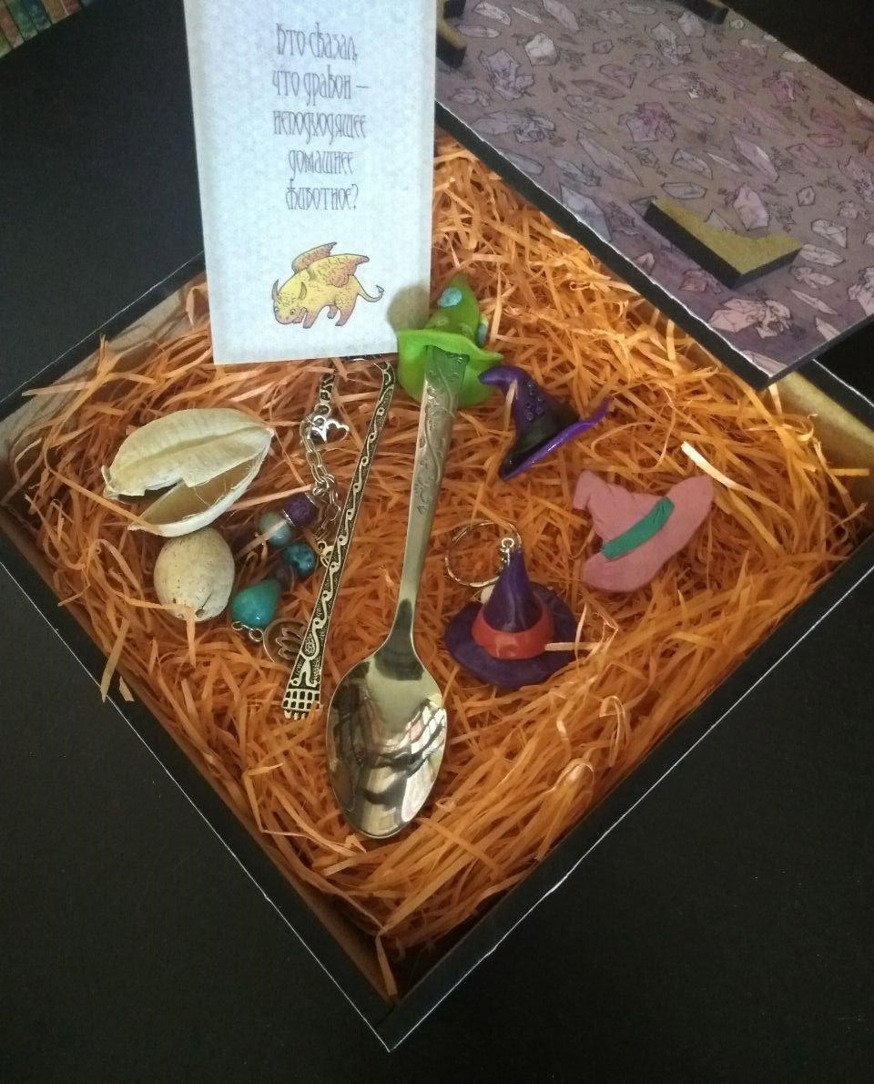 ![]() | Внутри коробки: закладка для книг, ложка с полимерным украшением, две броши (плоская и объёмная) и брелок. Все плюшки -- ручная работа моего авторства. Я ещё, конечно, учусь, но мастерить шляпки мне нравится и надеюсь, вскоре они станут достойны того, чтобы их было не стыдно предлагать как доп к печатной Дистел. | ![]() |