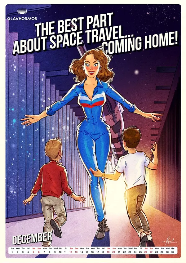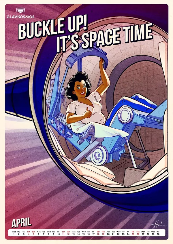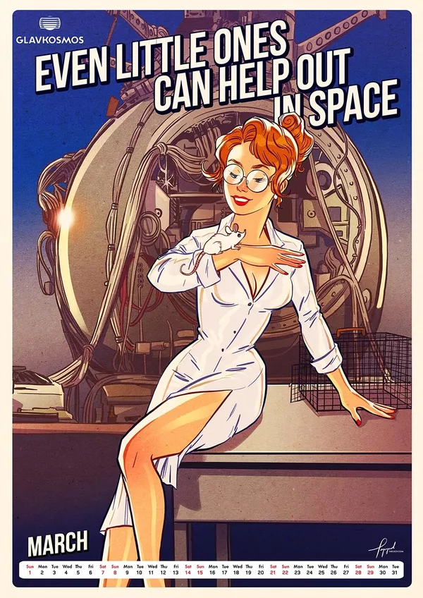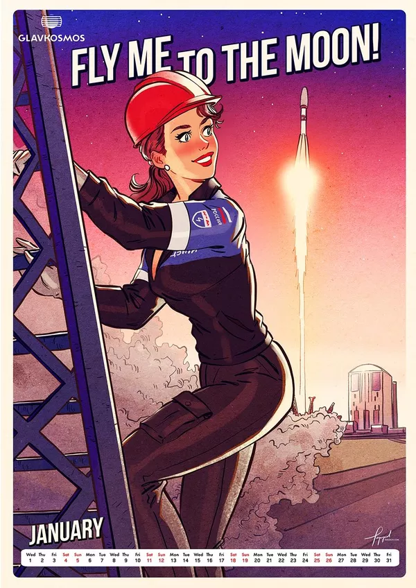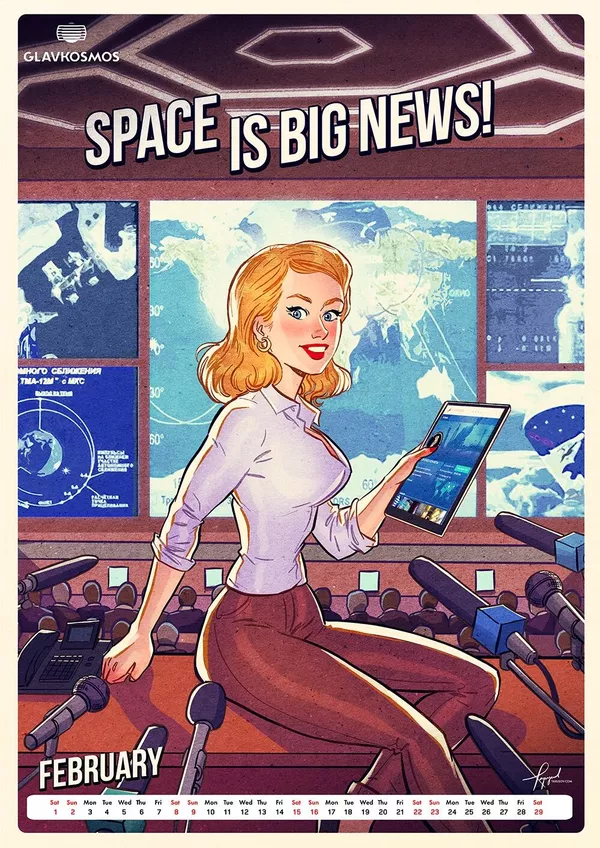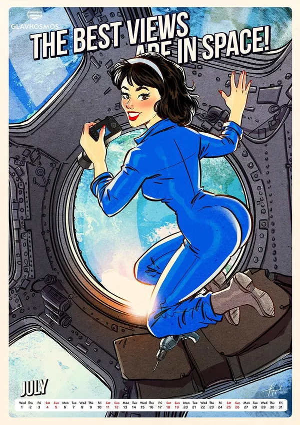 "Главкосмос" — дочернее предприятие "Роскосмоса" — заказал художнику календарь в качестве подарка для зарубежных партнеров. В календаре много пасхалок и скрытых шутеек, подсказывает художник. Героини пин-ап отличаются соблазнительными формами.
