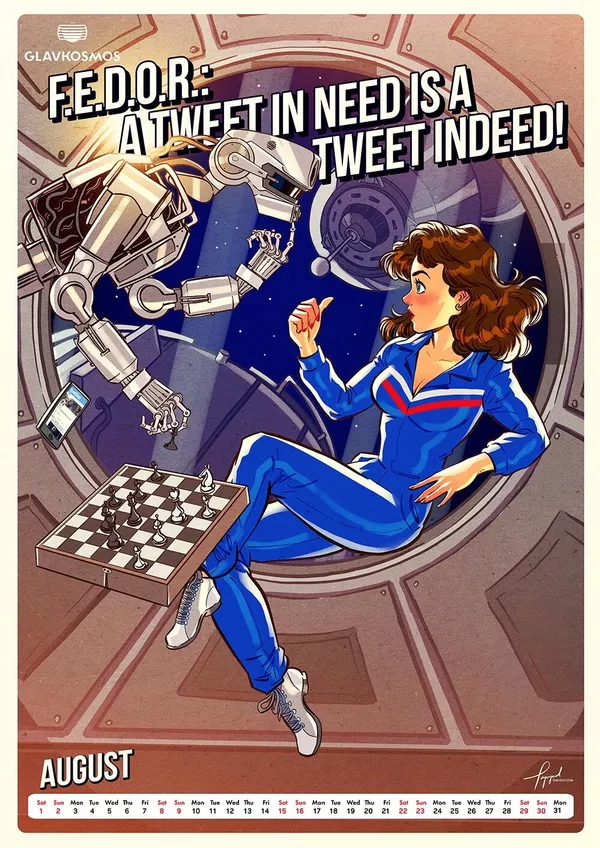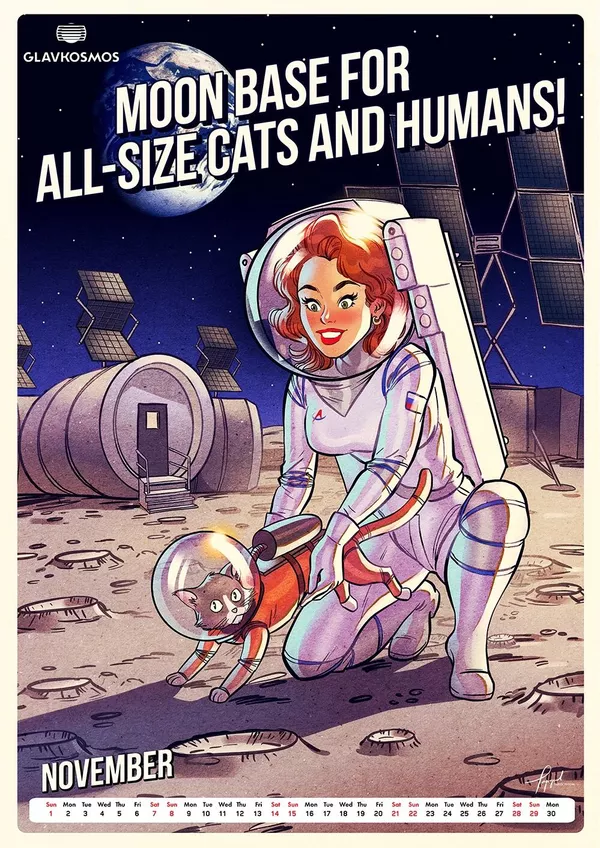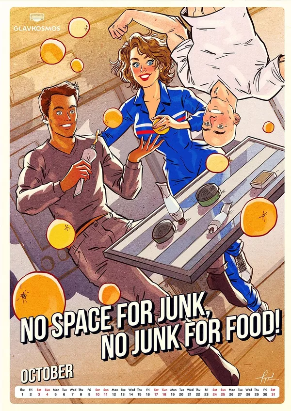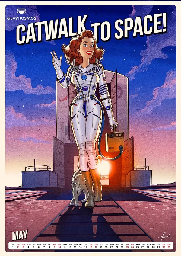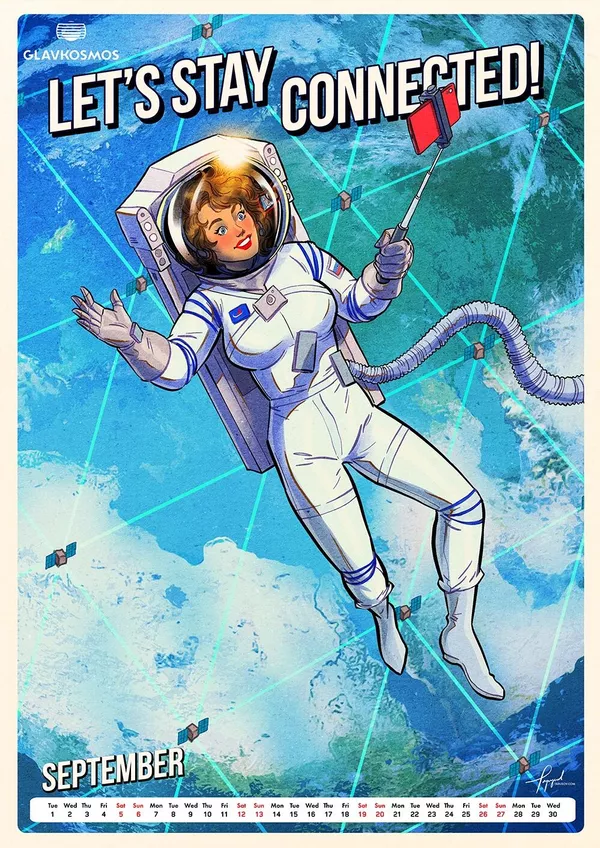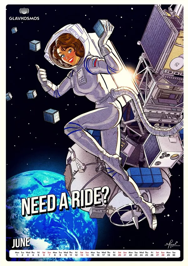 "Главкосмос" — дочернее предприятие "Роскосмоса" — заказал художнику календарь в качестве подарка для зарубежных партнеров. В календаре много пасхалок и скрытых шутеек, подсказывает художник. Героини пин-ап отличаются соблазнительными формами.