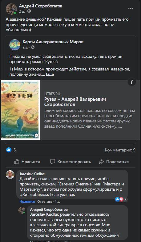 Автор: Андрей СкоробогатовВообще, самопиарные посты в соцсетях я накидываю совершенно спонтанно, часто параллельно с другими делами и в свободную от творчества минуту. Честно говоря, я не ожидал, что флешмоб "Пять причин" получится таким активным, и при этом с такой маленькой реакцией на изначальный пост (о том, что я ещё и попытался отрекламировать ссылку на конкурирующий ресурс - тактично умолчу):