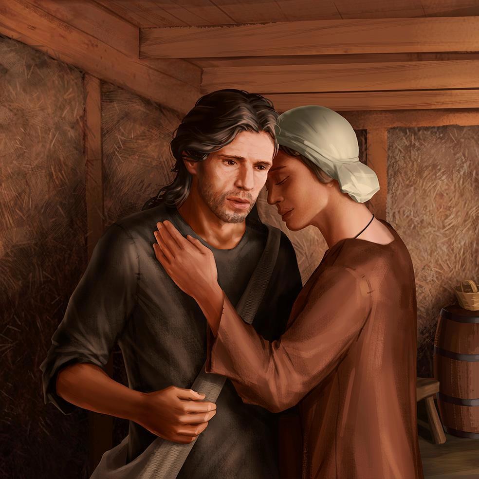 [Деревянная дверь одного из домов приоткрылась. Мерцание из небольшой щели оказалось единственным источником света – кстати, издали его вполне можно было принять за луч от небольшого фонарика. Я подошла, прислушалась – тишина. По законам жанра наступает эротическая сцена, да? В студенчестве будущие медики какие-то только веселые препараты себе не варят – скажу по опыту, средневековье будет фоном или нет, но все обычно заканчивается порнушкой. В данном случае, оставалось надеяться, что обойдется без нее. Пришлось прищуриться, чтобы подсмотреть: сначала разглядеть удалось только часть стены и две неподвижные тени. А затем они стали шевелиться, и обладатели их встали прямо как для лучших снимков в стиле папарацци. «Мы уходим отсюда, - тихо и уверенно произнес мужчина, - решили даже, что уплывем. Удастся доберемся до Камбре, если Господь так захочет – все может получиться». Женщина стояла прямо перед ним, не позволяя рассмотреть мужскую фигуру целиком, но куда там – не узнать Жана Бодена было невозможно! «Ты знаешь, что я думала раньше, брат, и теперь не изменила решения: или ты оставишь эти свои дурные мысли, которых наслушался где-то от бродяг, ходящих от дома к дому, или, если кто придет искать тебя, никто из нас не будет знать, где ты – даже жив ли ты». «Думаю, никто не станет искать, и не увидимся с тобой больше. – вдохнул тот, - Если я и вернусь в эти края, то так скоро, как одному Господу известно».