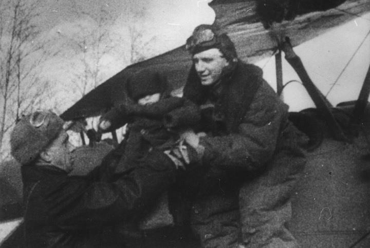 Все стали выпрыгивать в снег, только летчика не было видно. Партизаны поначалу подумали, что он сбежал. Но оказалось, что его выбросило из кабины. Мамкин лежал в кустах неподалеку – обгоревший, весь в крови и без сознания. Несколько детдомовцев отправились на разведку и вскоре наткнулись на красноармейцев, заметивших самолет и спешивших к озеру.