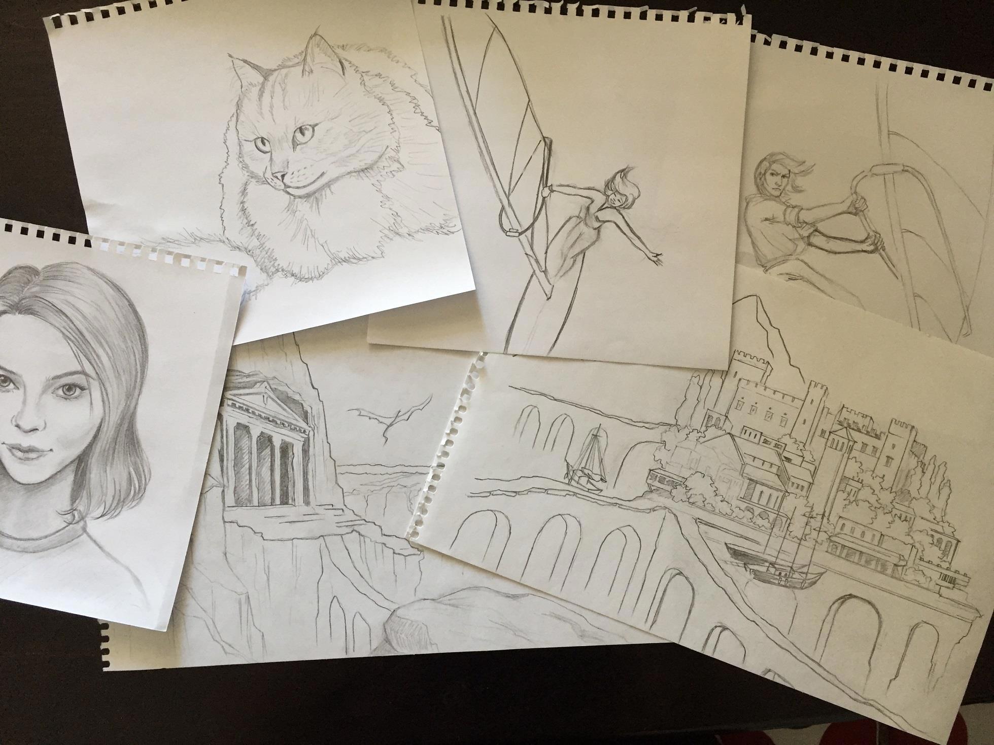 Обычно я машинально рисую эскизы, когда долго думаю над какой-нибудь главой, особенно если она включает в себя диалоги. К моменту завершения книги набирается несколько таких куч:
