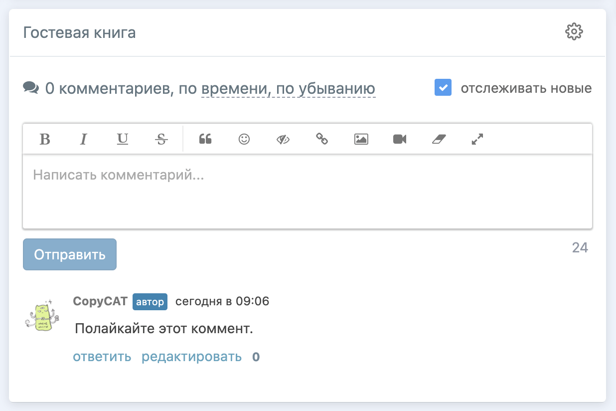 - Полайкайте его коммент в его гостевой книге (это нужно для кармы, без которой нельзя постить блоги).