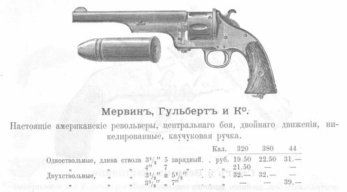 Не знаю, о чем речь, но двухствольный МервинЪ-ГульбертЪ и Ко с 7-ми дюймовым стволом под .44 патрон я б с руками оторвал. 39 целковых за такое чудо - прям копейки.