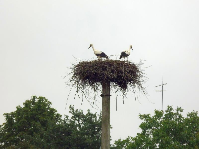 Есть здесь такое гнездо, где аисты из года в год высиживают птенцов. Я их называю "поворотные аисты", потому что гнездо у поворота с тропинки на главную улицу.