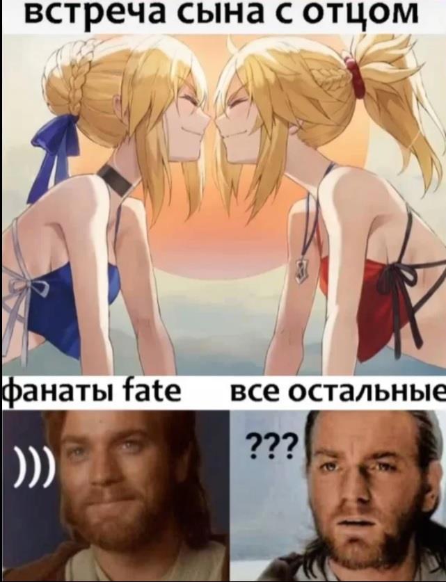 Сверху Артурия Пендрагон (в синем) и ее "сын", который на самом деле дочь "Мордред" (в красном)