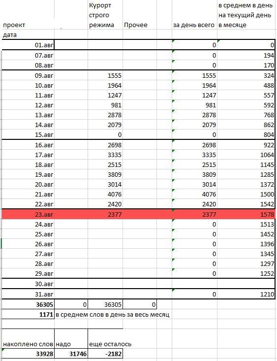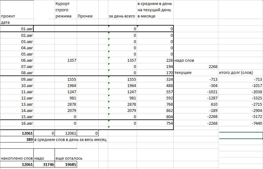Так как у меня четкая цель, сколько за август должно быть написано, то вычислила - мне надо писать в среднем в день по 2268 слова. В принципе, в июне я уже достигла свою планку в 2 тыс слов в день. Учитываю я только написанное для текущей истории. Как уже упоминала - всякие посты в бложиках и любые тексты вне истории, я не учитываю (хотя колонки в таблице зачем-то сделала).