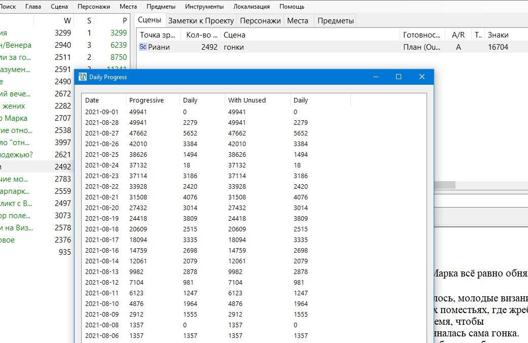 2) поглавно с подсчетом в "знаках". Заодно видно продвижении с самой историей (ведь в день могу писать много, но всякие "рабочие" сцены, которые может так и не войдут в готовую историю). Здесь же подсчет итогового текста истории