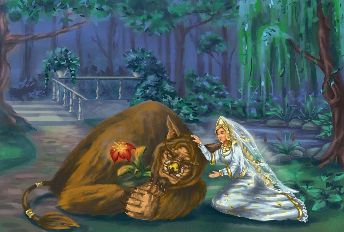 Алёнушка сидит на пригорке рядом с Чудовищем, заботливо расчёсывает его шерсть.