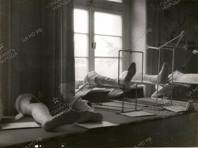 Медицинский стенд с экспонатами. Шины, гипсовые лангеты, растяжки.