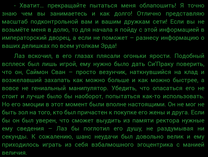 Это я еще привел самый короткий пример, обычно автор хуярит по три-четыре страницы таких пояснений, перемежающихся десятком описаний лора, которые можно смело пролистывать, потому что на сюжет он не имеет никакого влияния. В итоге, если из семи томов отжать всю воду, останется наверное двухтомник с довольно примитивным сюжетом и бедной фабулой. Что при интересной задумке вызывает прямо-таки физическую боль от испанского стыда.