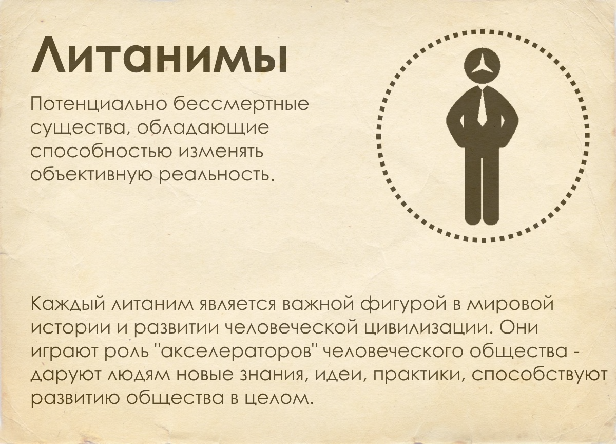Литанимы - основа развития человеческой цивилизации в этом мире. Все самые важные научные открытия, изобретения и т.п. принадлежат именно этим существам.