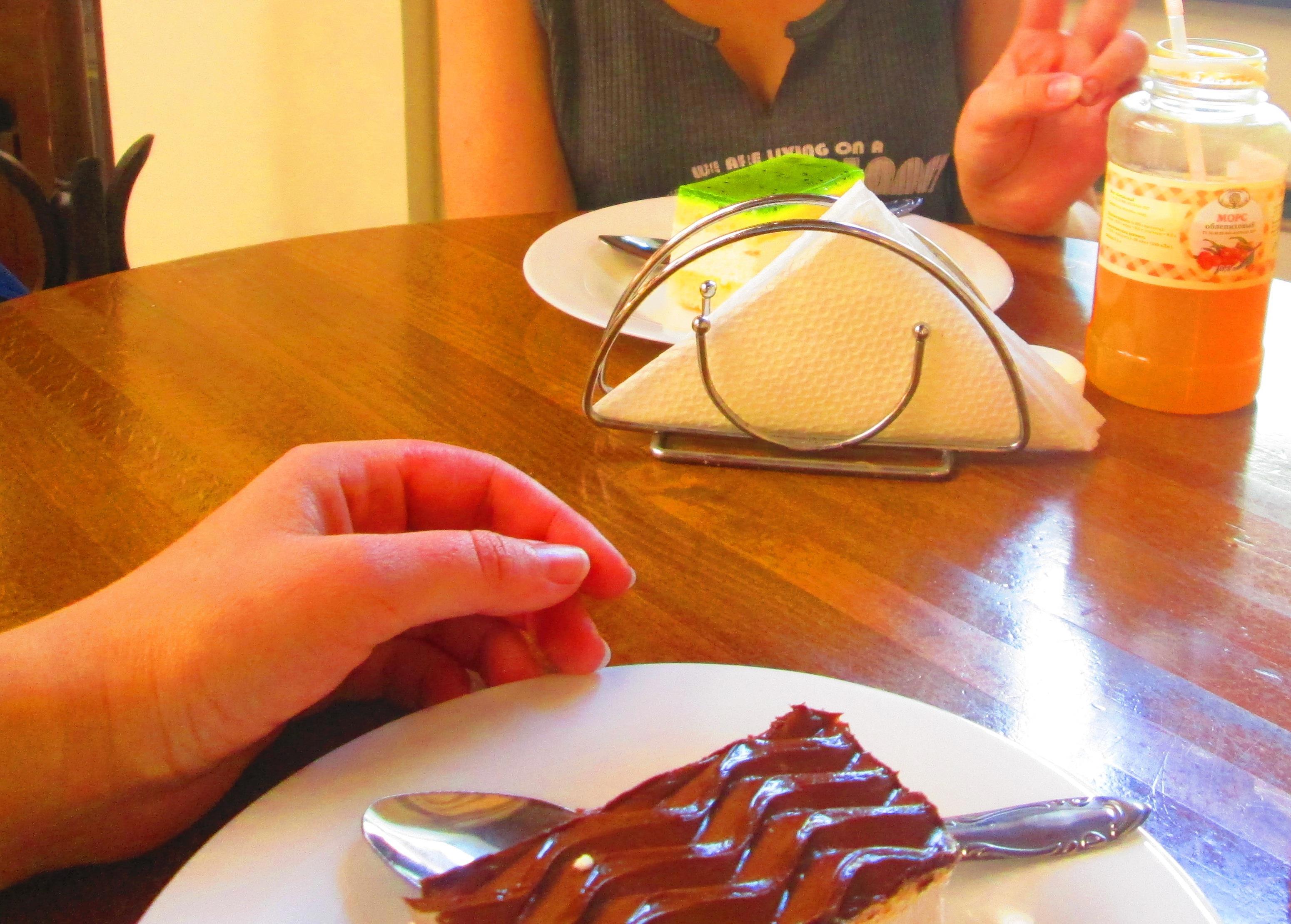 Однако, на часах было время обеда, и мы заглянули в кондитерку «Яблонька». Там отличный ассортимент салатиков, котлеток и отбивных, и, конечно, сладостей. И все, кстати говоря, недорогое в отличие от других заведений. Еженедельно бывают скидки на какие-то категории товаров. В общем, мы остались довольны обедом)
