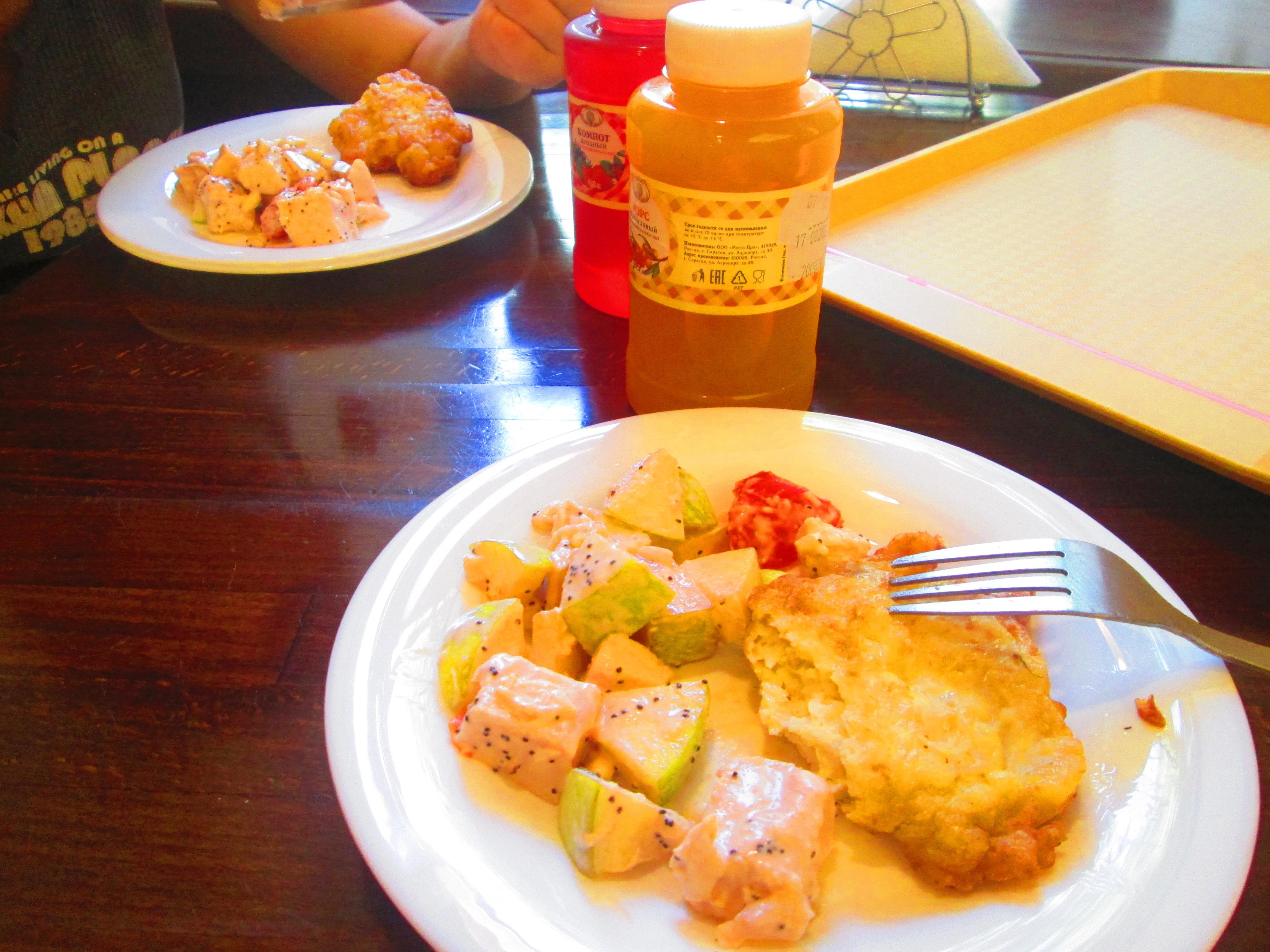 Заказали салат «Дамский каприз» (с куриной филешкой в придачу), который порадовал нас пикантностью, ягодный компот и облепиховый морс, и пироженки.