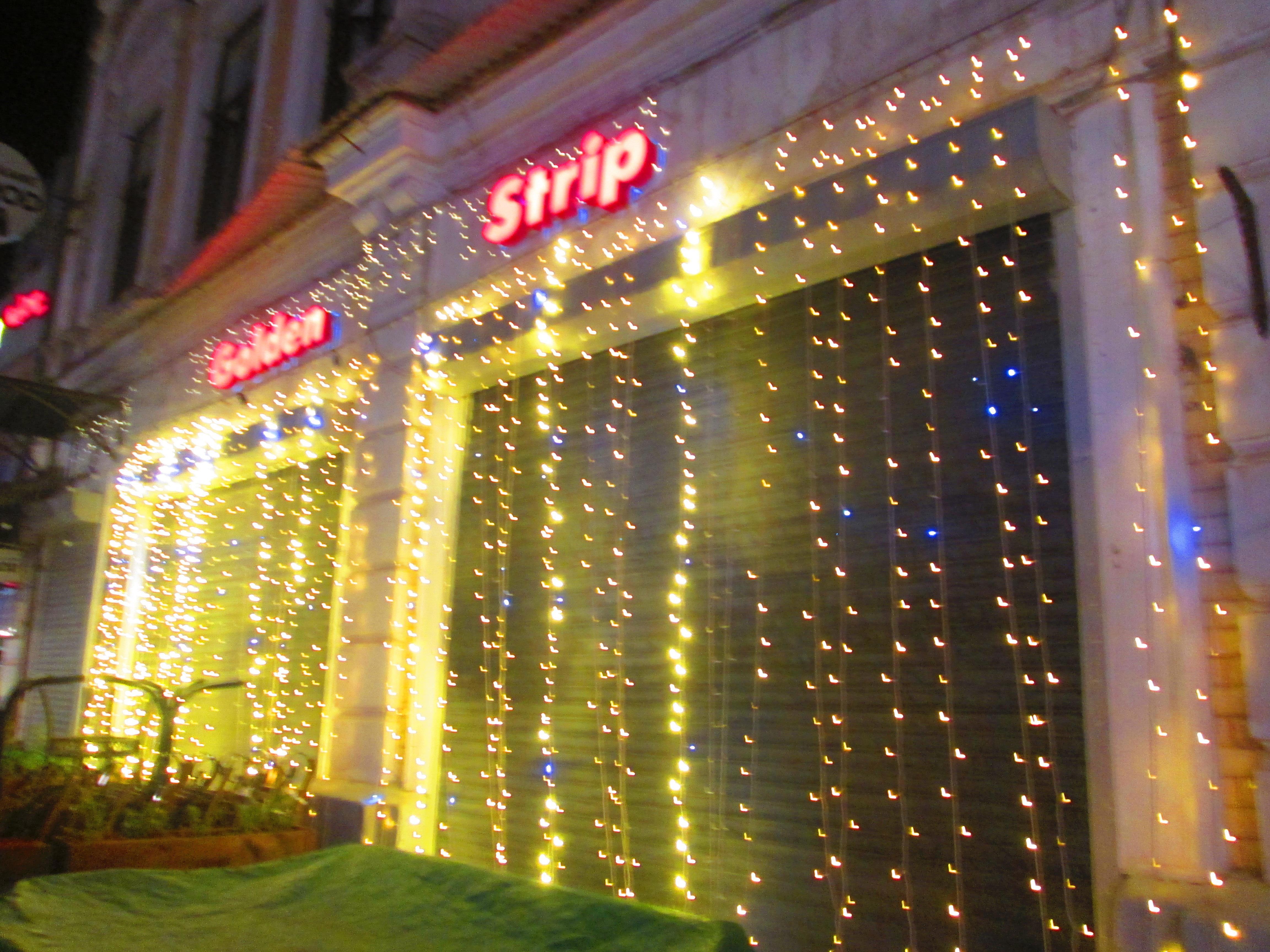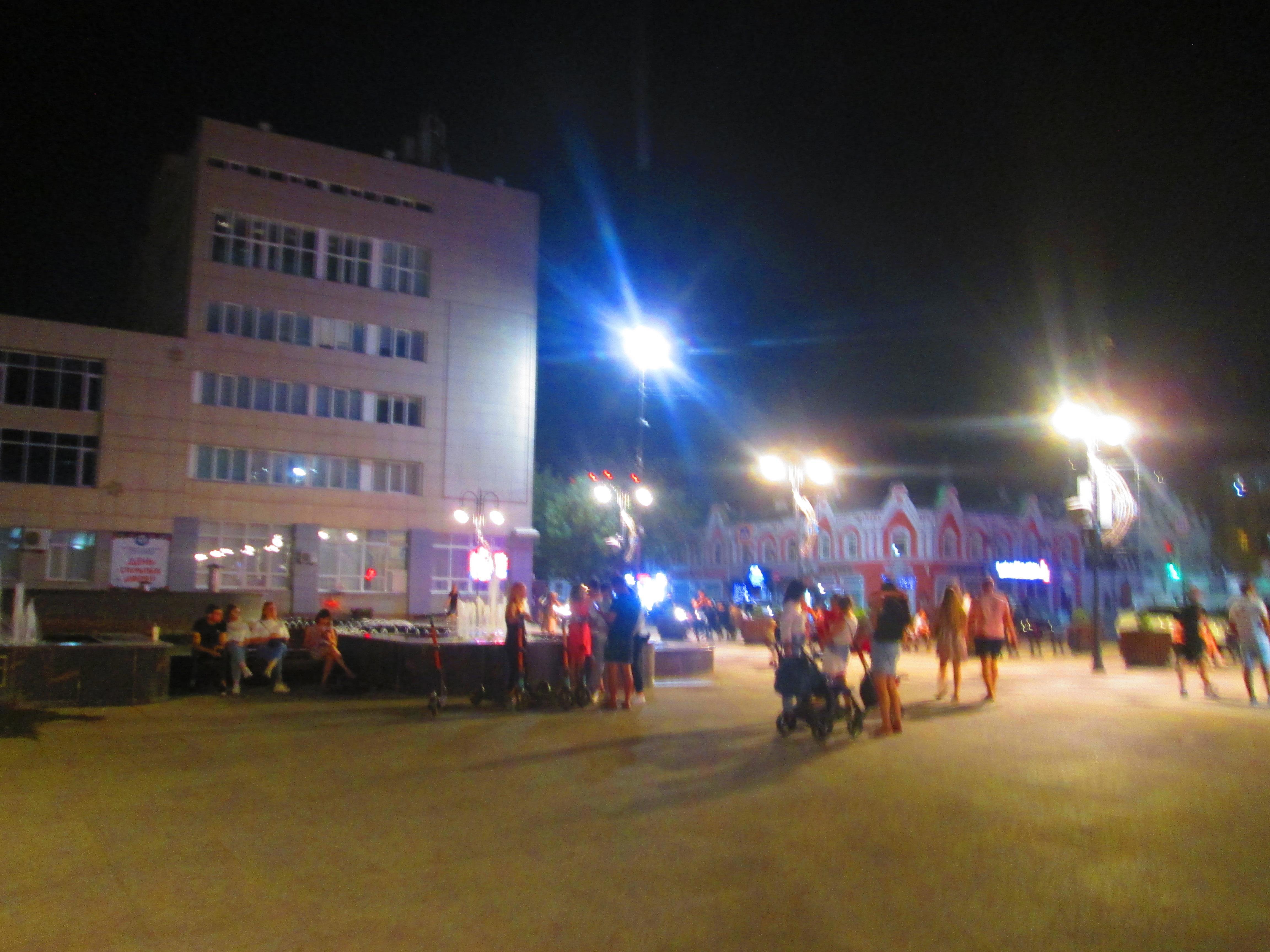 Потом мы прошлись к фонтанам у готического здания филармонии и обратно. И направились по Кирова в сторону вокзала, дошли до Рахова. Полюбовались светящимся зданием цирка, аллейкой в огоньках. Жара по прежнему была неимоверной, и нам хотелось влезть на какой-нибудь из поливающихся газонов.