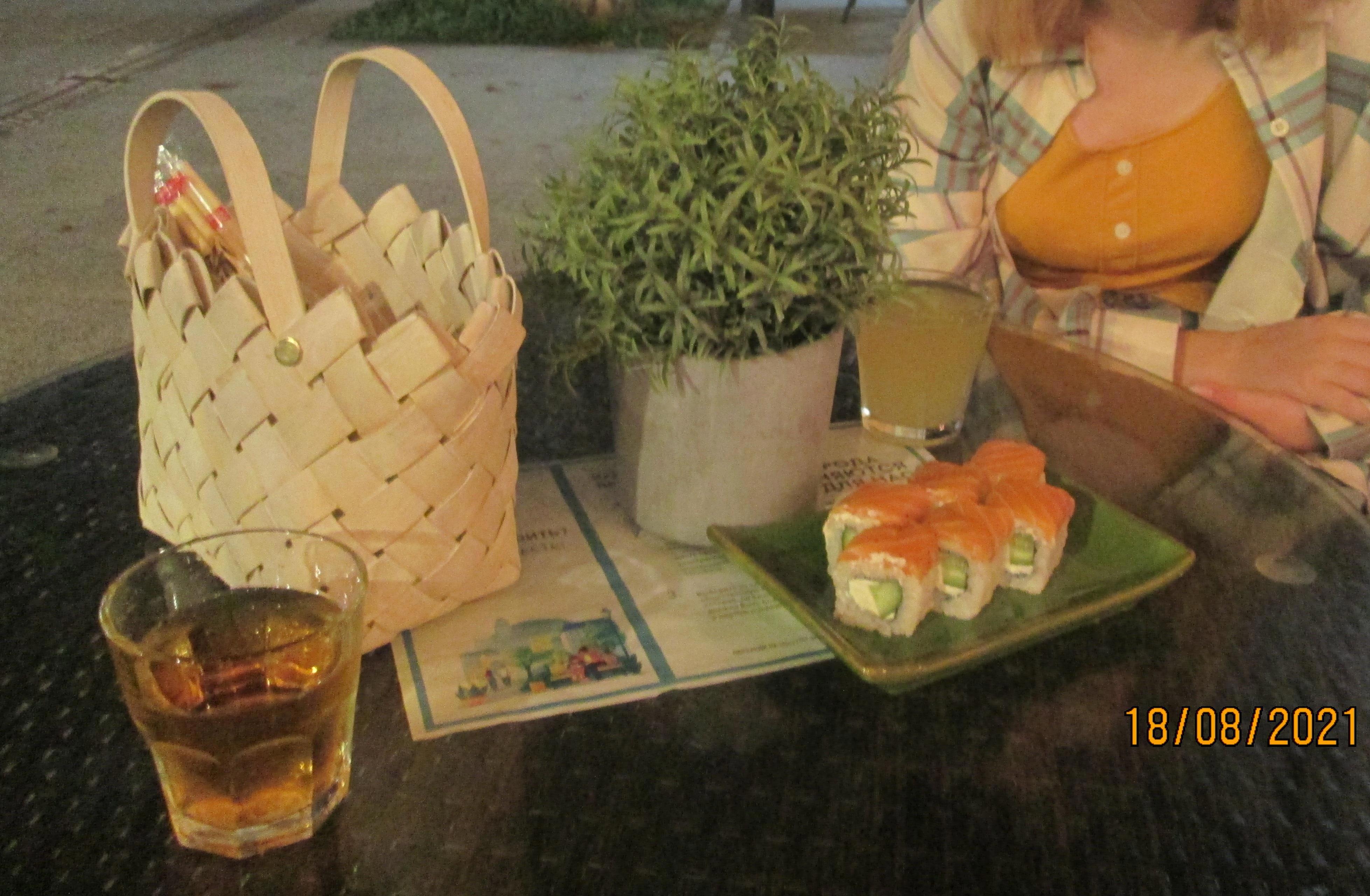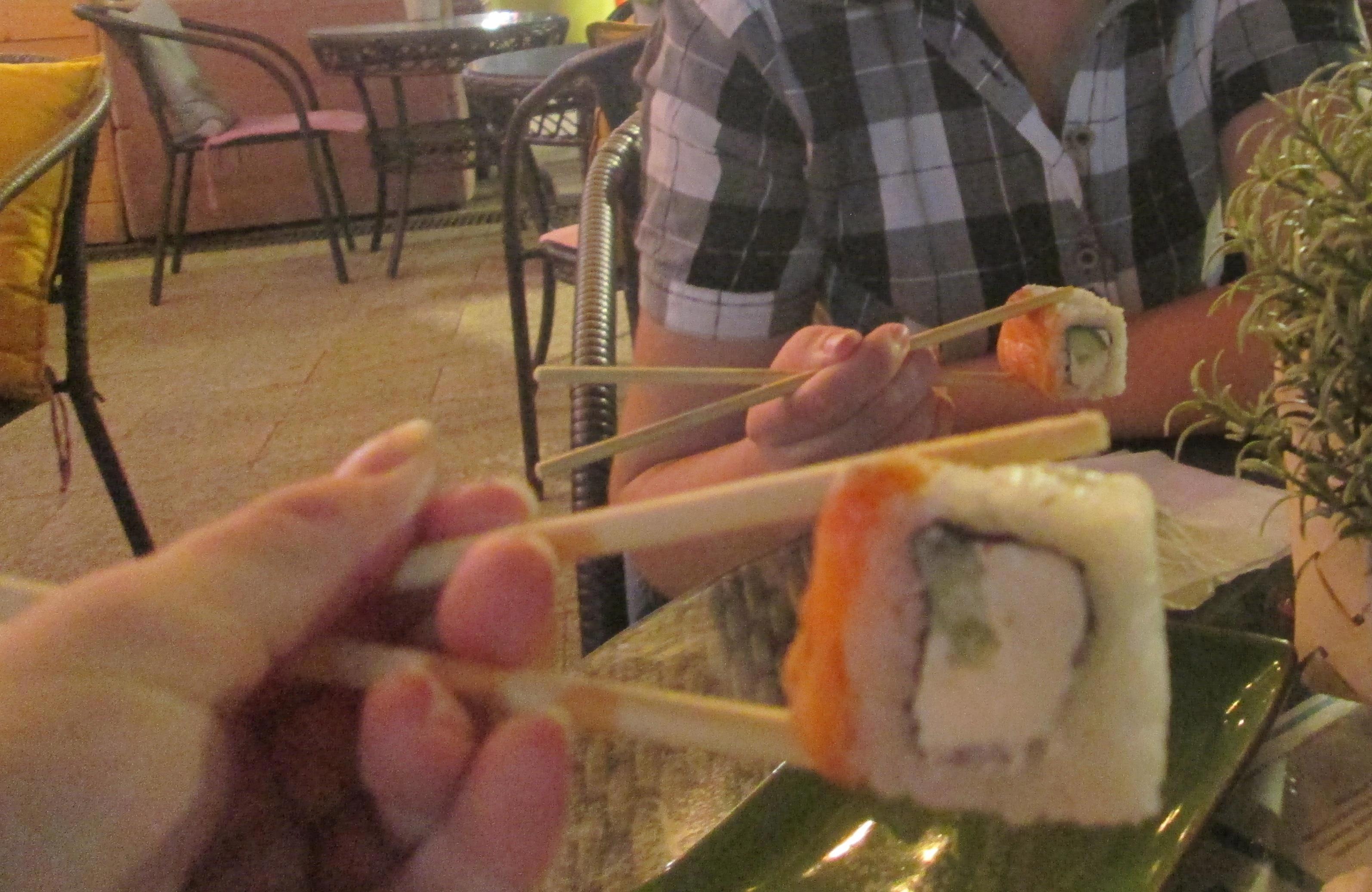 Первым делом поужинали. Решили заказать суши. Я их вообще ела лет сто назад, да и то не в этой жизни)) А ребенок мой и не пробовал вовсе! Потому, мне пришлось вспоминать, как пользуются палочками, (почти вспомнила), а моей маленькой левше — учиться брать роллы. Заказали классическую «Филадельфию». И по соку. У дочки — масса впечатлений, она мечтала это попробовать. А я рада и счастлива, когда мое дитя радо и счастливо!
