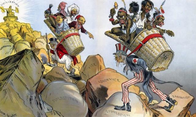 Вот англо-саксы - Джон Буль и дядя Сэм , потея и напрягаясь тащат к цивилизации всякую дикую сволочь. Русских, правда не видать - наверное выпали из корзинки.
