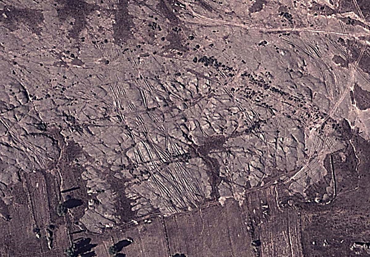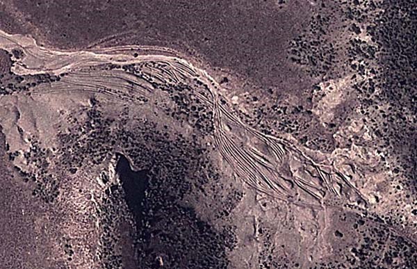 Всё? Нет, не всё. Есть ещё несколько мест с окаменевшими следами колёсной техники и самое грандиозное из этих мест отлично видно даже не с самолёта, а из космоса. Вот фото со спутника: