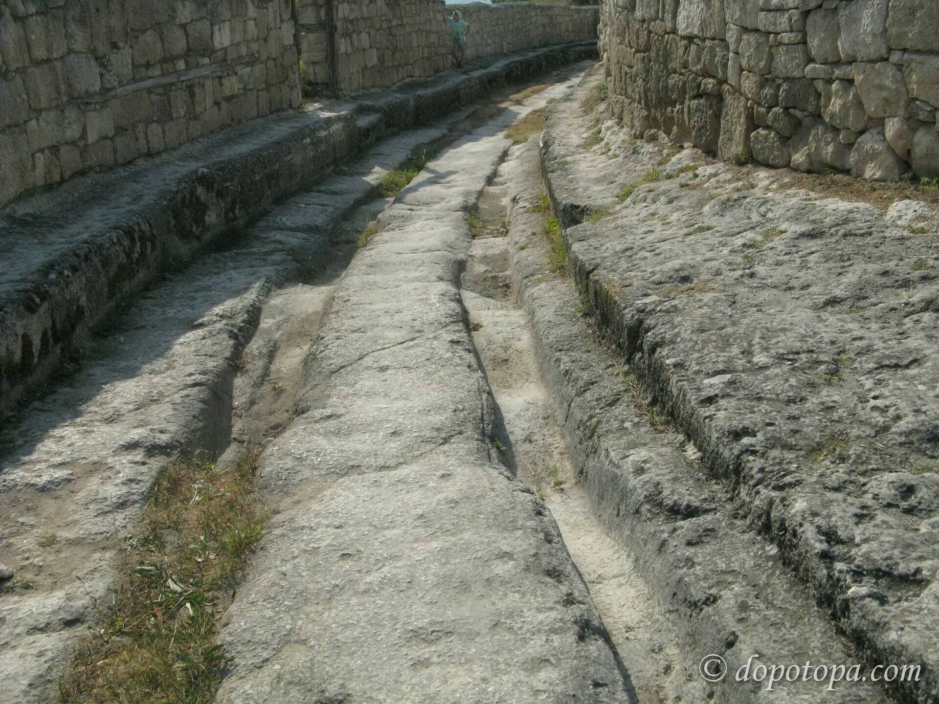 Ну а как быть людям этих самых развитых цивилизаций, если ехать нужно, а вот дороги в пункт назначения не построили пока? Естественно, ехать по бездорожью. Люди ведь существа упрямые и отсутствие дороги их остановить не может. Это в нас ещё от диких предков. Видели, наверное, окаменевшие следы динозавров? Да и первые люди такие следы оставляли. Сначала отпечатки босых ступней, потом следы обуви, потом – следы от колёс. И всё это – в камне. Есть ведь и такие в разных местах нашей планеты. И это совсем не обязательно какие-то богом забытые уголки вдали от цивилизации. Иногда они есть прямо в городах… Можно вспомнить, например такие следы от колёс в Крыму. Там они есть в посёлке Чуфут Кале и в других местах. Не заметить их достаточно трудно. Сами посудите – при таких-то размерах: