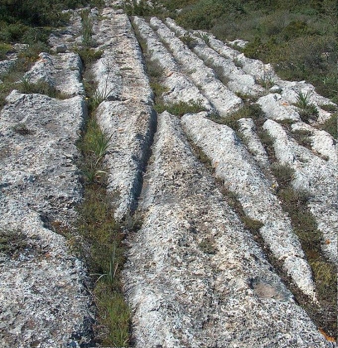 Если вы подумали, что это ещё один снимок из Фригийской долины в Турции, то это делает честь вашей наблюдательности - действительно очень похожие следы, но вот только снимок сделан недалеко от Тласкала в Мексике. Это не единственные следы на Американском континенте, кстати. Но всё же Европа нам по понятным причинам куда ближе и поэтому посмотрите на фотографии из департамента Буш-дю-Рон во Франции: