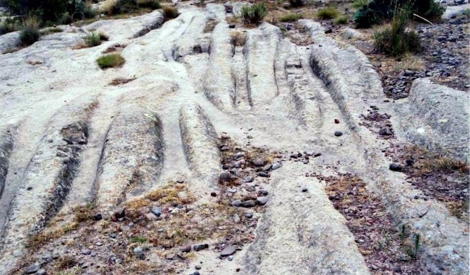 Это место находится в Турции и называется Фригийской долиной. Фотографии на месте сделал Александр Колтыпин. Сразу заметно, что на Мальтийские следы это не похоже совсем, да и следы из Крыма и Апшерона напоминает только слегка. Длина района, прорезанного многочисленными колеями, составляет 65 километров, а ширина – около пяти километров. То есть направление таки прослеживается, хотя назвать это «дорогой» явно грешно. Вторая серьёзная неприятность – все эти пути идут «из ниоткуда в никуда». То есть опять явно читаемой цели просто нет. Мало того, в этой зоне общего направления колеи могут вести себя достаточно фривольно – вплоть до пересечения под прямым углом. Получается, что речь идёт не о перевозке каких-то товаров из пункта А в пункт Б, а о зоне свободного поиска чего-то кем-то. Причём всё это происходило «когда-то». Историки как-то буркнули, что это следы фригийских телег и все дружно молчат теперь, как партизаны на допросе. А вопросы ведь есть и даже самые простые из них ответа не имеют. Например – что возили? Или ещё один «например» – а откуда известно, что телеги были именно фригийскими? Да и вообще – откуда известно, что это именно телеги, а не что-то иное? Дело в том, что следов тягловых животных или людей на всей этой огроменной по площади территории не найдено ни в одном месте. Да и ширина колёс (до 23 см!), судя по следам, явно не тележного размера в отличии от той же Мальты, например. Ширина колеи вполне нормальная - около 1,5 м. В остальном просто мистика какая-то… повторяется история с Крымскими колеями.