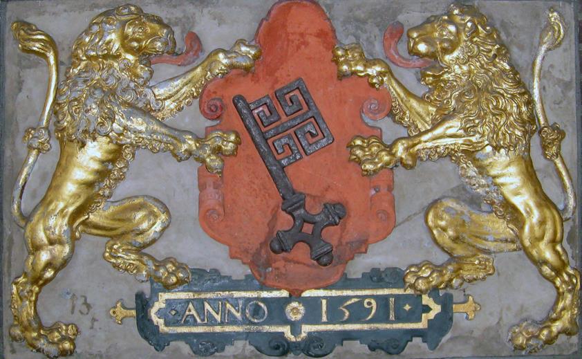 Но большой герб Бремена украшают другие животные: два льва, поддерживающие красный щит с серебряным ключом. Ключ — символ апостола Петра. Собор Бремена тоже посвящён Святому Петру.