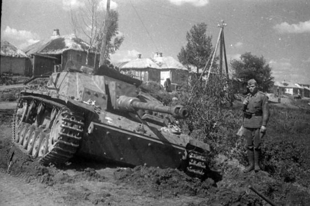 Штуг сел на брюхо на кромке канавы. (Точно так же встрял Тигр в описанном раньше танце экипажа Мнацаканова). Исправная совершенно техника. Нашим приходится часового оставлять, а то быстро распатронят.