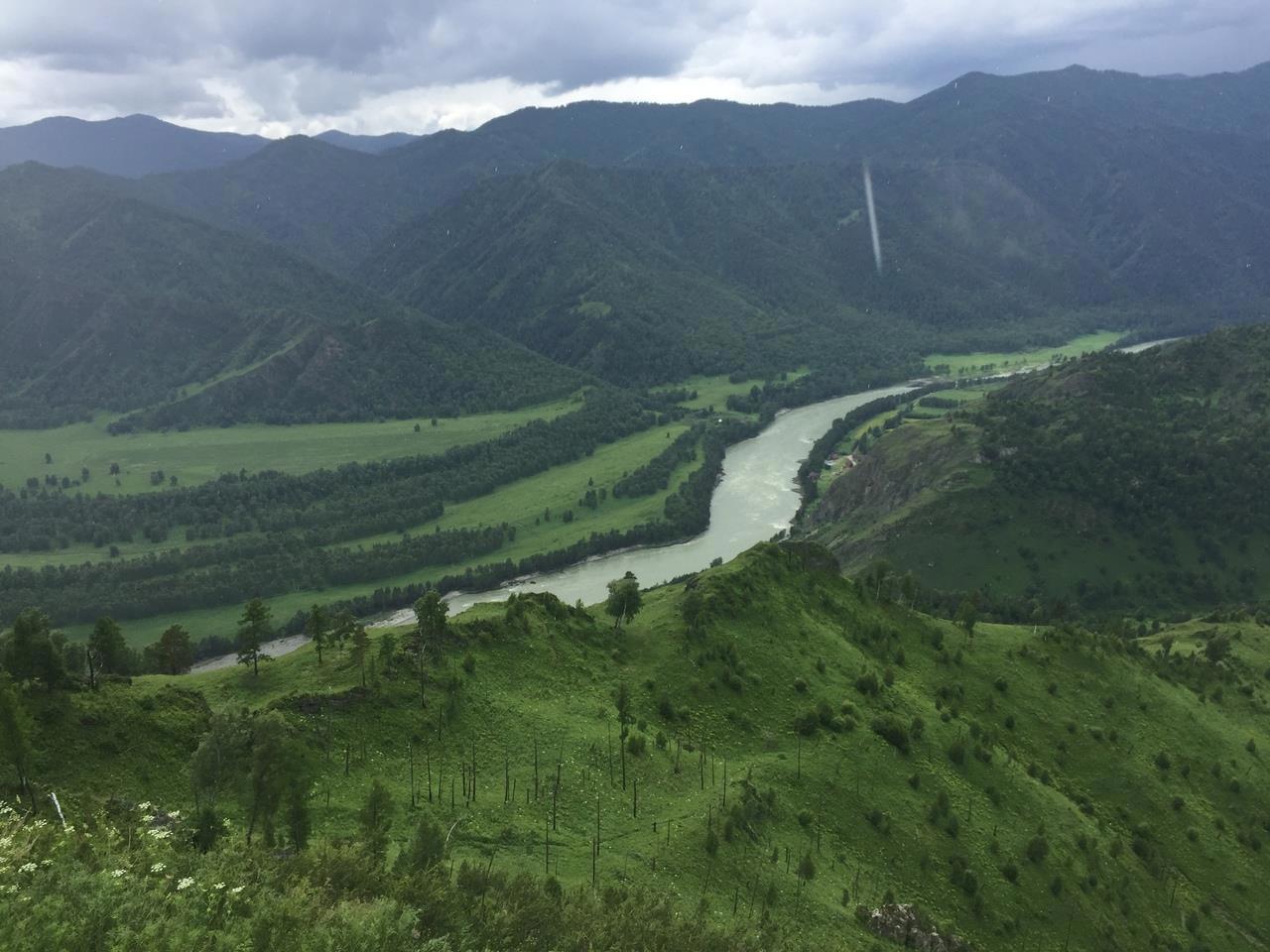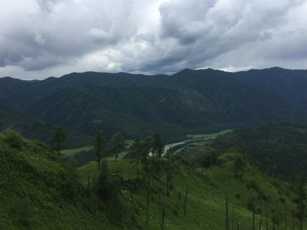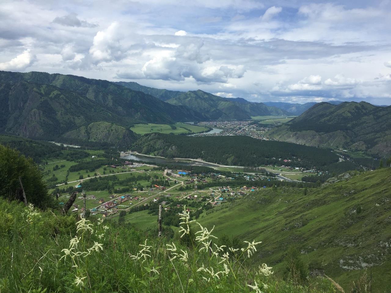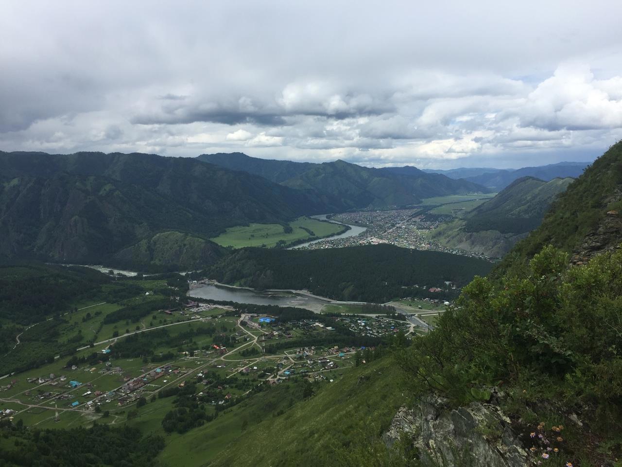 Со второй вершины, где нас хоть не на долго, но всё же застал дождь, село Чемал напоминает больше карту, чем реальный вид.