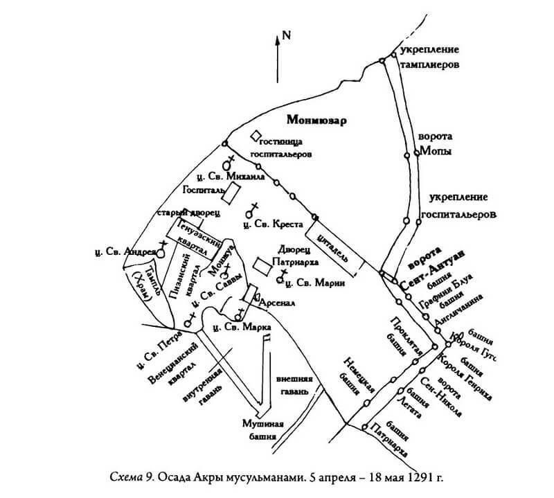 Для обороны города стены были поделены на четыре сектора. Тамплиеры и госпитальеры отвечали за защиту левого фланга – от побережья до ворот, св. Антония, а рыцари «малых орденов» составили сводный эскадрон. Далее располагались войска «сводного отряда» тевтонцев и лазаритов, затем французский контингент вместе с рыцарями ордена св. Фомы, под командованием сенешаля Жака де Гралли, войска кипрского королевства под командованием коннетабля Амори де Лузиньяна. На правом фланге находились венецианцы и «папские наемники», прибывшие в 1290 г. , а за ними пизанцы и городское ополчение [6, стр. 55].