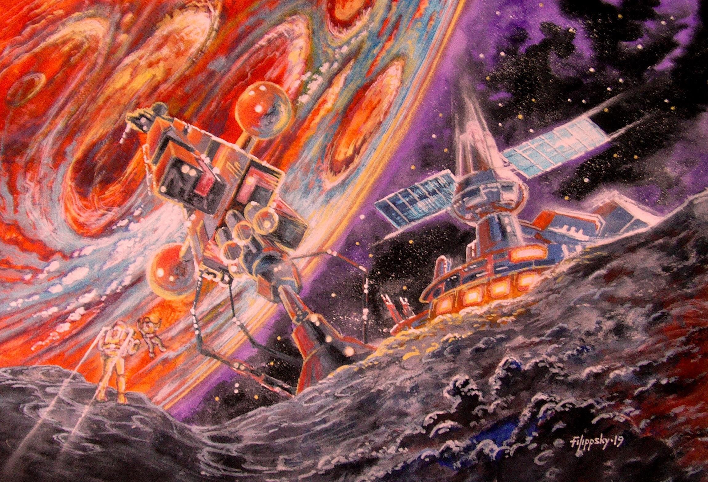 Недавно я отрыла работы художника Fillippsky. Старшее поколение (видела в комментариях и мои знакомые) утверждают, что работы напоминают им детство. Написаны в стилистике советских иллюстраторов фантастики