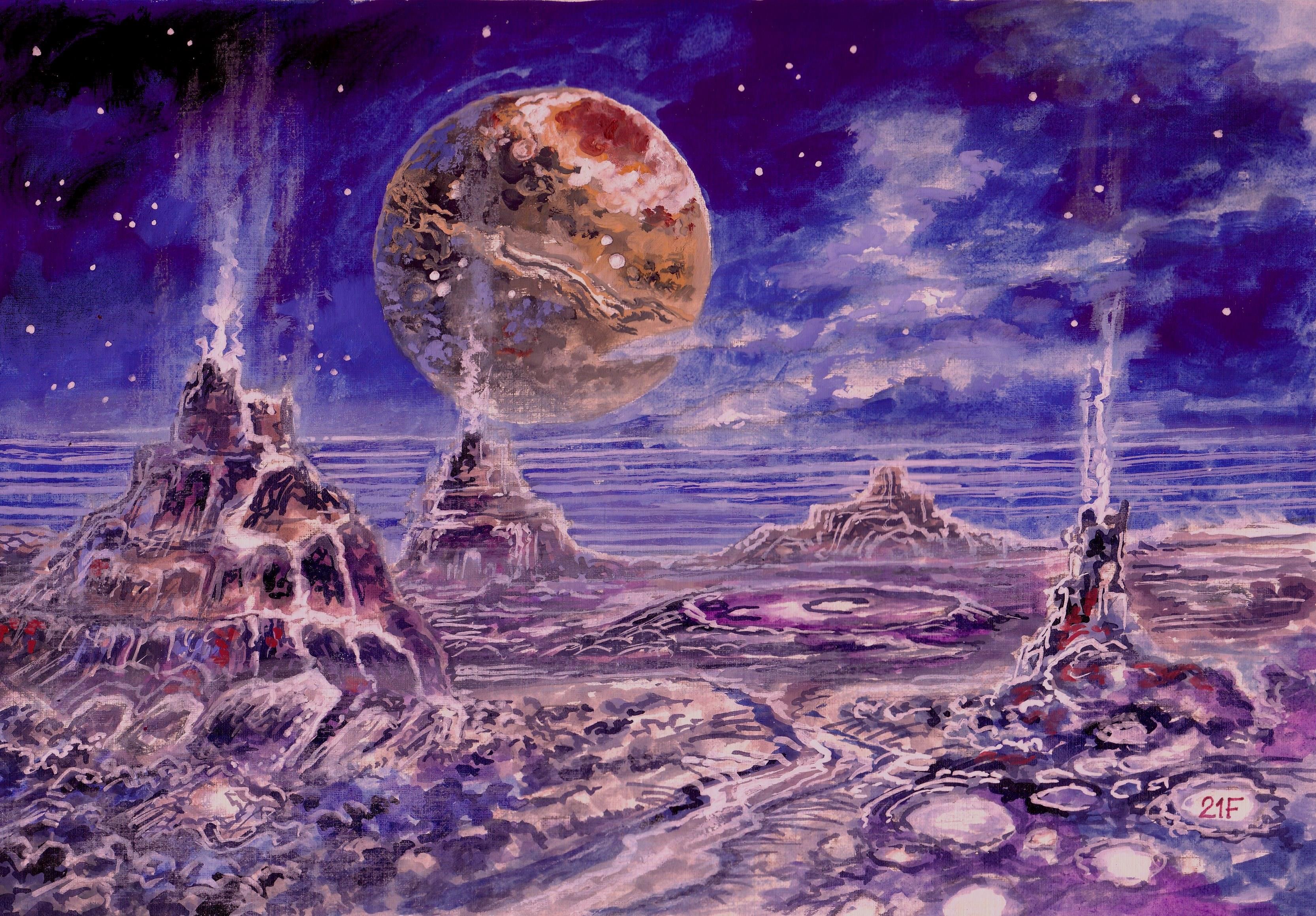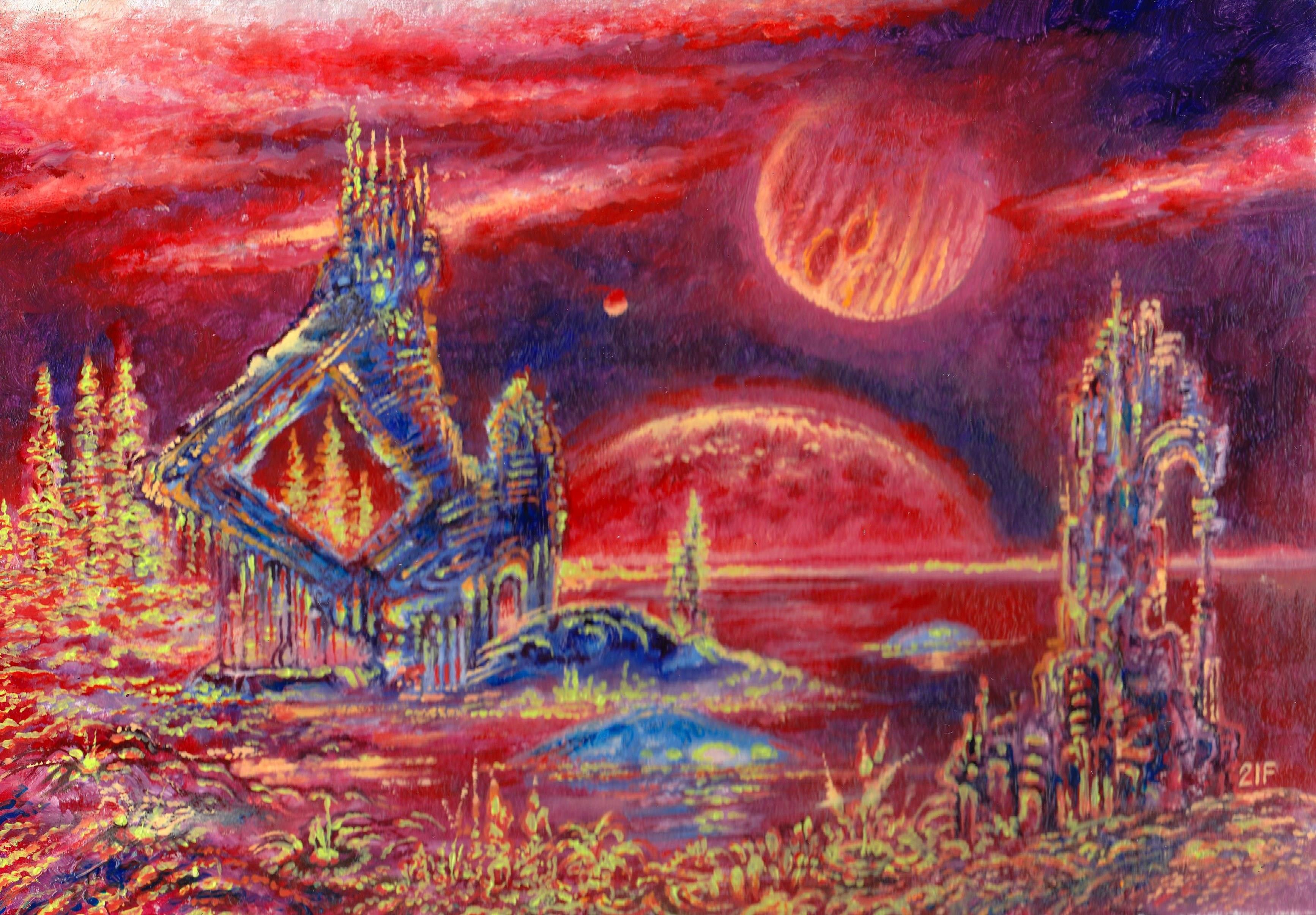 за счёт жёлто-коричневого архитектурного объекта справа, неких голубых форм за ним, напоминающих горы и контрастного фона. Но большинство глубинных мизансцен присутствует в работах художника на космическую тематику. Глубина создана при помощи космических объектов. Например планет: