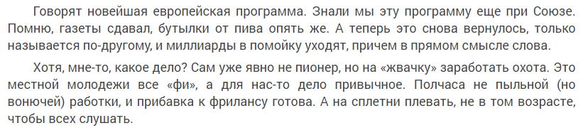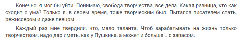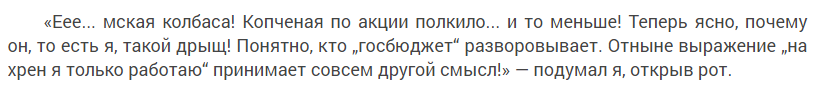 Ну что? Похоже на посыл? Вроде бы никакой отсебятины, только образы из книги, и вроде бы даже похоже на смысл. А ведь это самое днище какое только можно отыскать на сайте. Это Мухин, это порно, и это блядь, даже не десять процентов того, что можно из текста вытащить. Да, я понимаю что это все я придумал, просто смеха ради но вместе с тем, все это в книге есть. Небольшими, прямо таки точечными правками, разбросав десяток нужных фраз, в нужных местах текста, можно увести книгу в сторону проблем современного писателя, в реваншисткие размышления о советском союзе, или поднять проблему поколений. Короче, если какие-то условные “смыслы” и “автор имел ввиду” можно найти(точнее придумать) даже в этом дерьме, то что уж говорить про остальных? Тексты классиков перенасыщены подтекстом потому что его ищут даже в “синих занавесках”, может быть в книгах современных авторов, смысла нет только потому, что его никто не ищет?