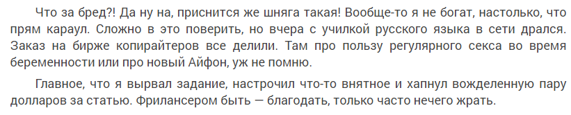 Итак, у героя огромный хуй, а самые большие писюны у кого? Правильно у негров! Герой негр. Не верите? А чем у нас герой занимается? Пишет тексты на заказ, а как называют тех кто пишет на заказ? Правильно - ЛИТЕРАТУРНЫЕ НЕГРЫ! Герой негр, может быть не по цвету кожи, не биологический, но СИМВОЛИЧЕСКИЙ НЕГР.