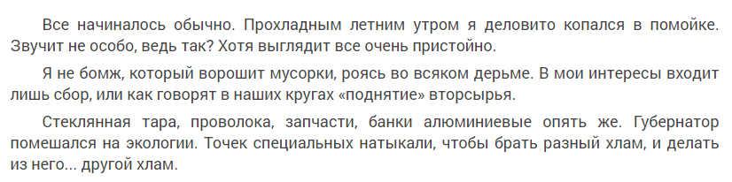 Итак герой у нас нищий неудачник, ничтожество которое ковыряется в помойках, но Мухин не просто констатирует факт - да ГГ лузер и роется в помойке - нет, он ОПРАВДЫВАЕТ его: