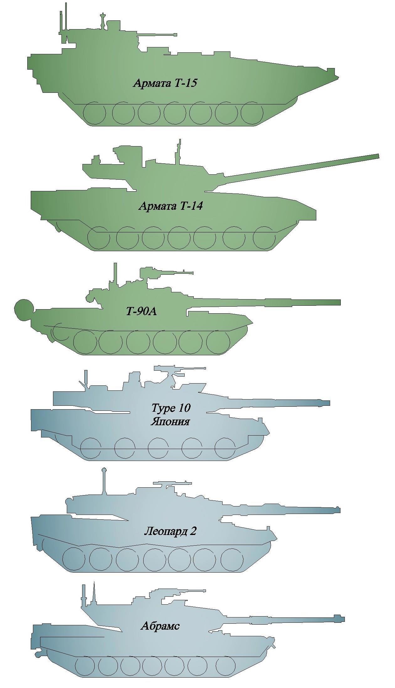 Замечу, что экипаж по три человека у обоих. Только забронированное пространство включает в себя не только экипаж, но и другие важные части танка (а неважных там и нет). То есть это пространство возросло всё. При этом говорят, что боевая масса танка осталась на уровне 48 тонн. То есть это примерно, как у Т-90? Это значит, что бронирование уменьшилось что ли на самом деле? А как же разговоры про высокую защищённость «Арматы»? Ещё есть «Армата», которая тяжёлая БМП Т-15. Её вес в разных местах дают от 48 до 50 тонн. Что даже тяжелее танка. Но она по размерам точно намного больше американской «Бредли» с её 30 тоннами. Или это «лапша на уши», или одно из двух. Чтобы ещё раз оценить разницу в размерах, я тут немного не поленился и нарисовал вот такую картиночку с танками и Т-15. Всё в одном масштабе, можете сравнивать: