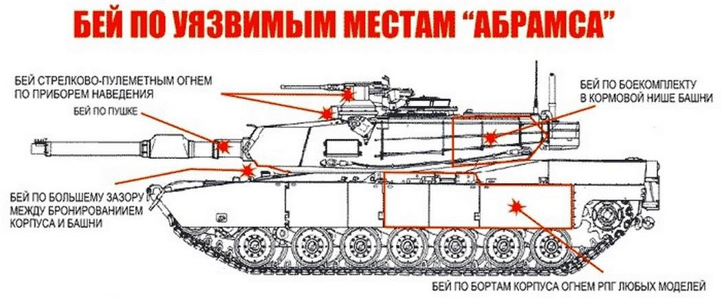 Теперь о массе. «Абрамс» стартовал с 54 тонн. При этом лобовая часть башни была толщиной 125 мм, а минимальная толщина брони – это днище в районе установки двигателя. Там всего 12,5 мм. Бронирование бортов – всего 35 мм. Потом масса брони только росла. В результате всех улучшений общая масса танка на сегодняшний день достигла что-то около 69,6 тонн. И при этом американцы говорят, что при проектировании они усиленно боролись за уменьшение габаритов танка! Плохо старались, однако, а потом ещё улучшали и усиливали. При этом всё равно уязвимых мест осталось немало. Если интересно, то вот схемка: