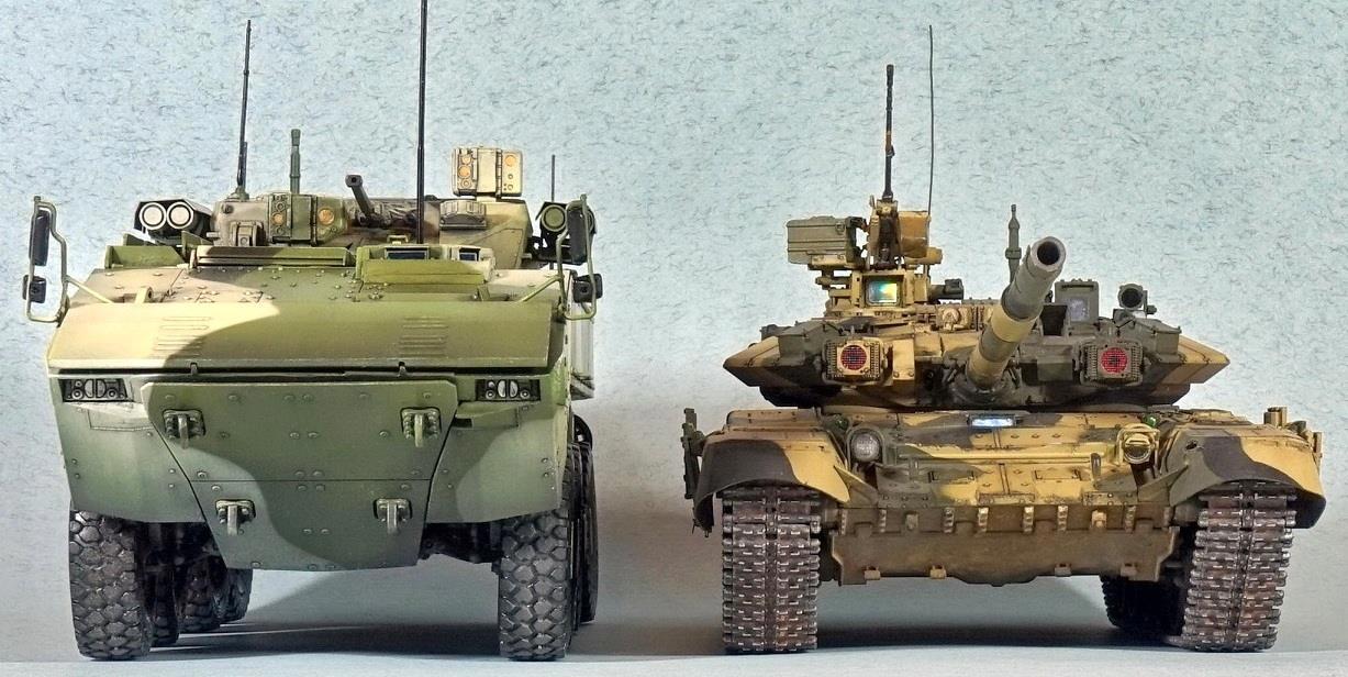 А ещё нашёл в сети картинки, которые нарисовал человек, у которого трудолюбия куда больше, чем у меня. Он поставил мысленно новейший колёсный «Бумеранг» рядом с танком Т-90: