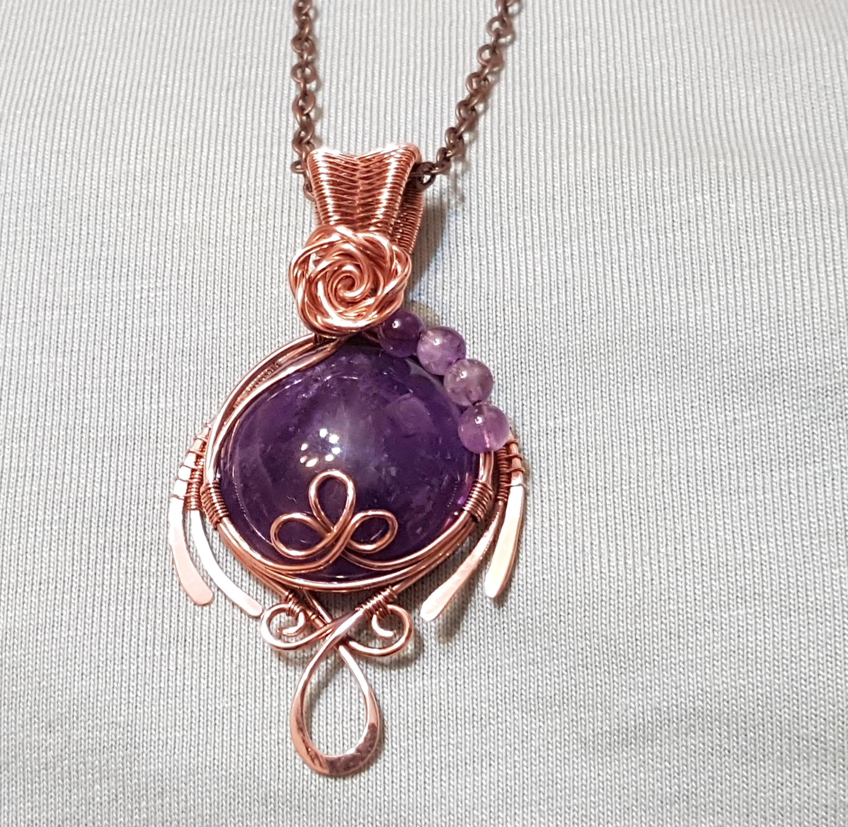 Подвеска "Вэлрия". Камень - аметист. Глаза капитана Вэлрии - фиалкового цвета, в точности как этот камень. У людей глаз такого цвета не бывает, а вот среди эльфов Дерта фиолетовый оттенок радужки встречается нередко. В плетении проволоки использованы растительные мотивы - лоза и бутоны цветов. Хотя Вэлрия не верит в старых эльфийских лесных богов, поклоняясь человеческому Единому Творцу (как многие молодые эльфы её поколения), она всё же как дома в самом густом лесу, и не один десяток лет прослужила егерем. Вэлрия неплохо владеет шпагой, но воинский аспект не главный в её личности - капитан в первую очередь харизматичный лидер, меткий стрелок и умелый следопыт. Ну и ещё она очень красива по людским меркам, так что бутоны роз здесь более чем уместны.