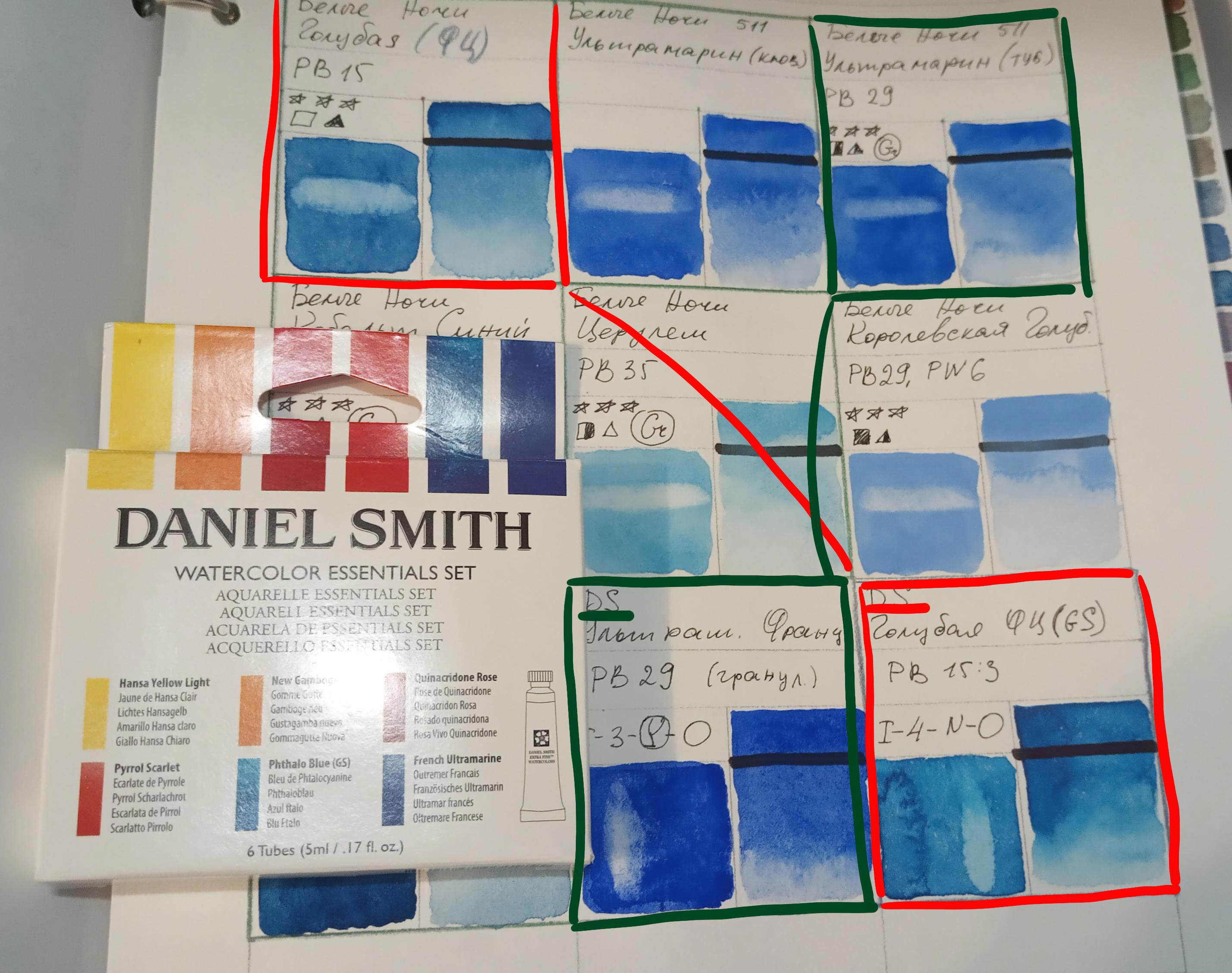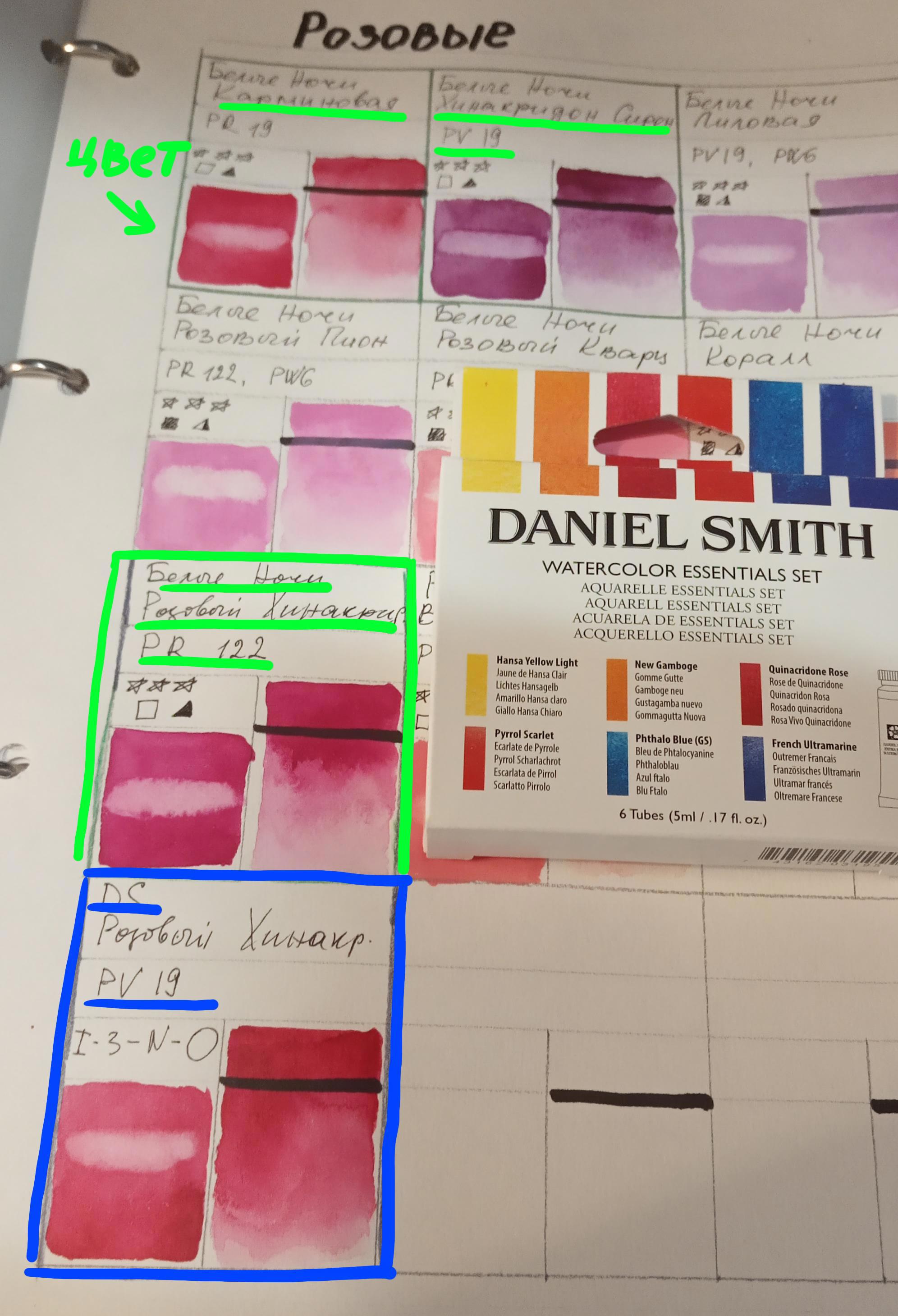 Вот на картинках видна разница красок Белых Ночей и ДС по Розовому Хинакридону, Ультрамарину и Голубой ФЦ.