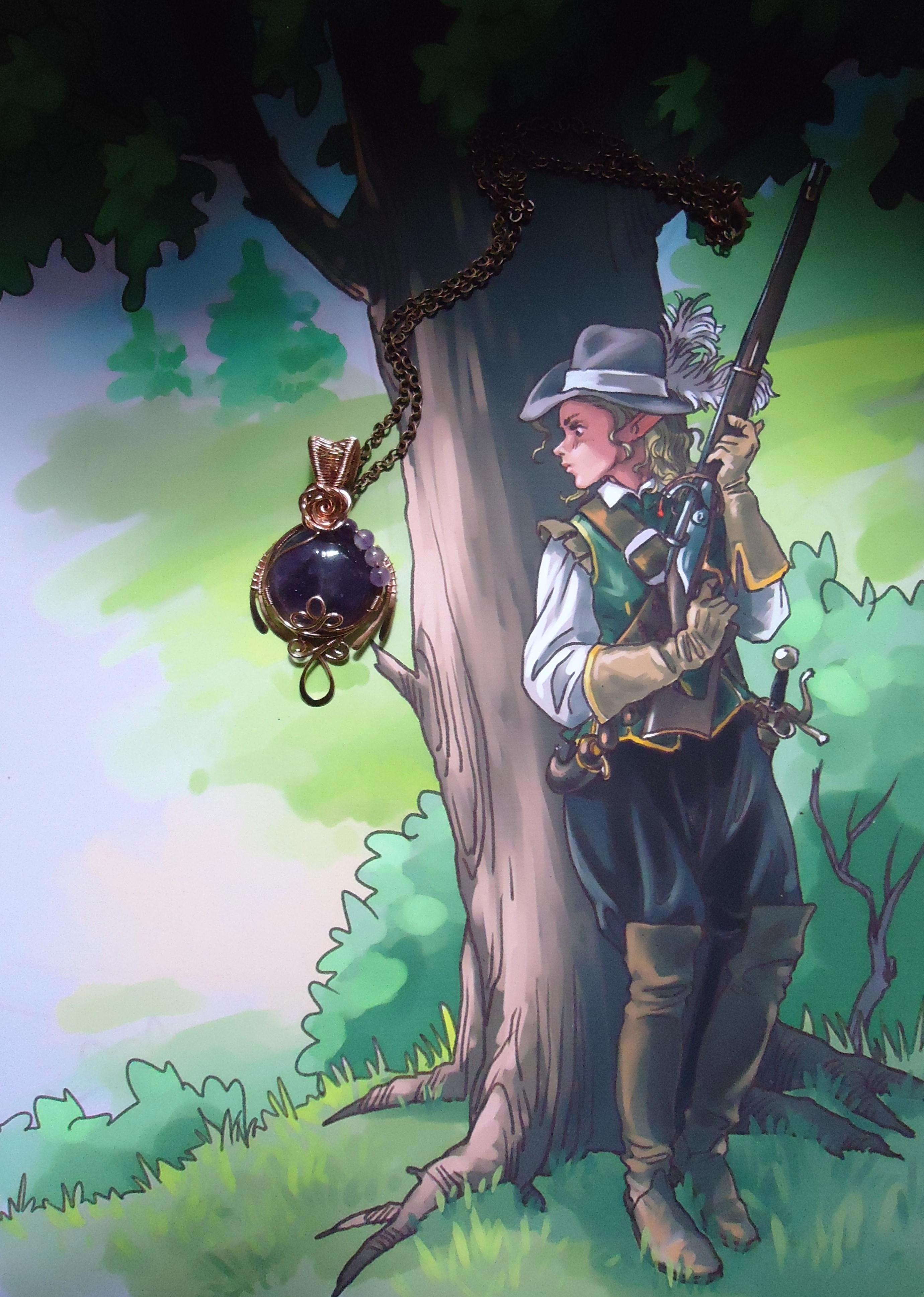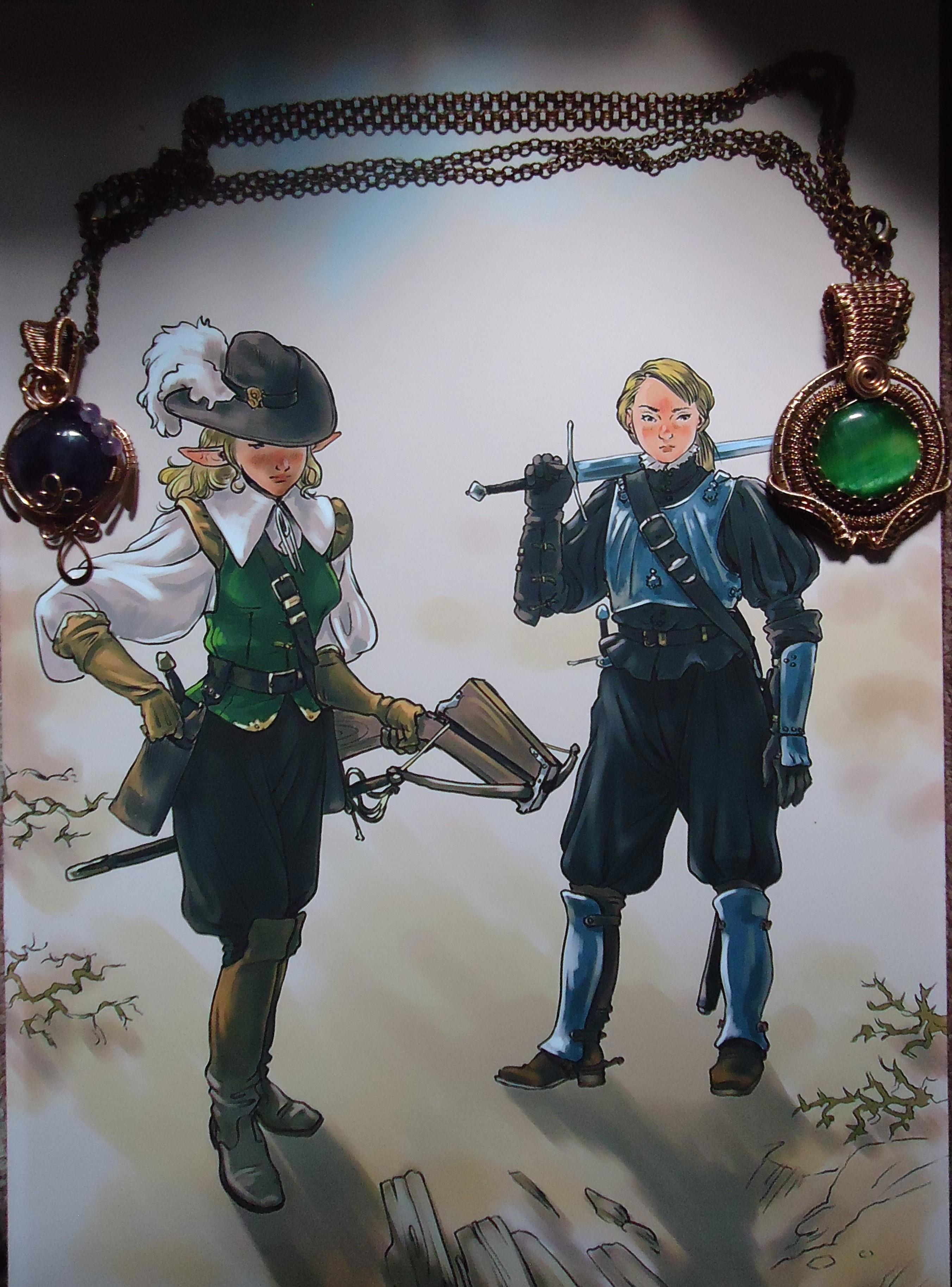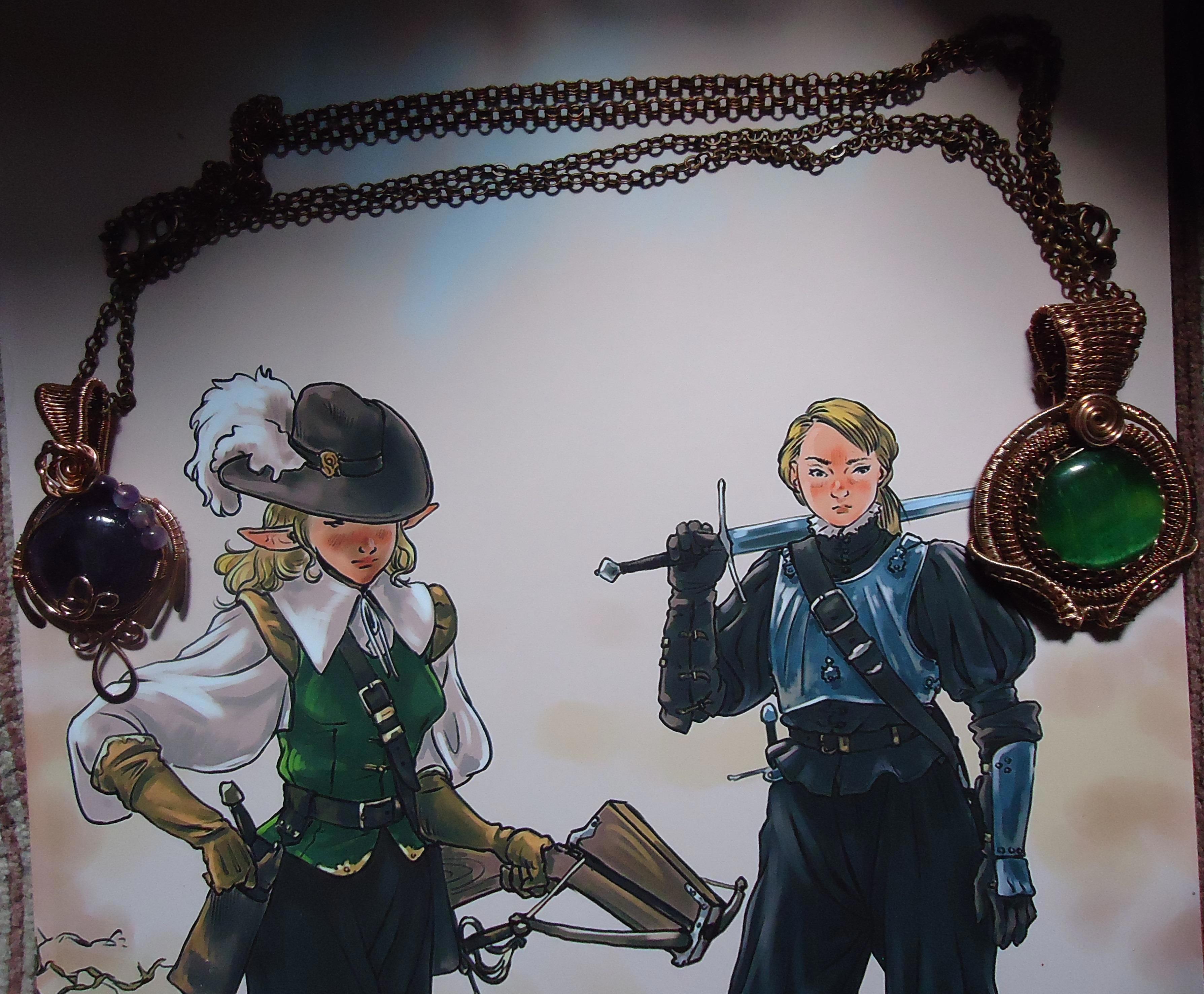Аметистовая подвеска и капитан Вэлрия слева, подвеска из тигрового глаза и сержант Даллан справа. Цвета камней соответствуют цветам глаз героинь, а плетение проволоки отражает их образы. Высокая и стройная эльфийка Вэлрия с её лёгким и жизнерадостным характером с одной стороны - и более коренастая и крепкая, всегда спокойная Даллан с другой.