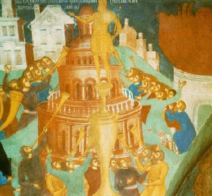 Это - изображение из храма Иоанна Предтечи в Ярославле - "Поклонение золотому тельцу". Как мы видим, никакого тельца с рогами и копытами здесь нет: хвалу люди возносят человеческой статуе. Можно сказать, художник осовременил ветхозаветный сюжет: звероподобные идолы уже тогда виделись в значительной степени анахронизмом, а вот сцены, подобные изображенной на фреске, можно наблюдать и по сей день.