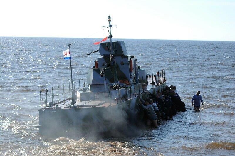 Есть ли что-то более бессмысленное и беспощадное, чем когда 30 человек в военной форме вручную снимают с мели бронекатер на виду у навороченной базы МЧС?