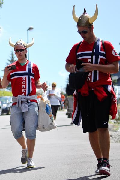 А как отличить норвежца от других скандинавов? Да очень просто! "Во-первых, он сам с первых же слов обратит ваше внимание на то, что именно он является норвежцем. Во-вторых, его можно узнать по значку в петлице: значок представляет собой либо норвежский флаг на фоне эмблемы лыжного клуба, либо эмблему лыжного клуба на фоне норвежского флага".