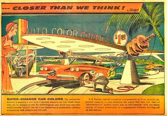 Возможность мгновенно поменять по своему настроению цвет любимого автомобиля, вероятно, может показаться привлекательной, но пока еще не реализовалась. Сегодня даже смена цвета ногтей занимает больше времени, чем покраска машины на этой картинке. Подобные технологии, кстати, пару раз встречались в полуфантастических фильмах о шпионах, где смена цвета машины могла помочь агентам скрыться от врагов.