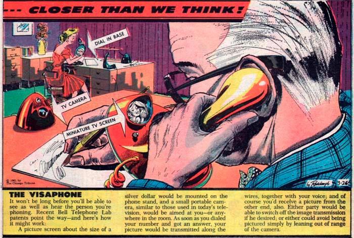 Телефон с возможностью видеосвязи долгое время казался близким, но трудно осуществимым. Технически люди давно могли сделать подобное, вопрос был, вероятно, в стоимости. Сегодня многие возможности реализуются благодаря интернету, а вот его-то никто из футурологов того времени, к сожалению, не предсказывал.