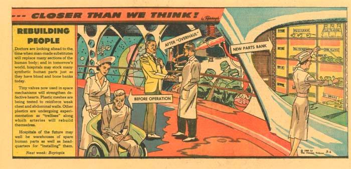 Вероятно, к 2020 году, по мнению людей из 50-х, человечество должно было победить большинство болезней, а в случае травм – иметь возможность просто «собирать» человека из запасных частей, т.е. органов. Нельзя сказать, чтобы этот прогноз выглядел сегодня глупо. Болезни, конечно, наступают, но и трансплантация уже практикуется достаточно давно. В лабораториях делают попытки действительно выращивать «запчасти» для человека.